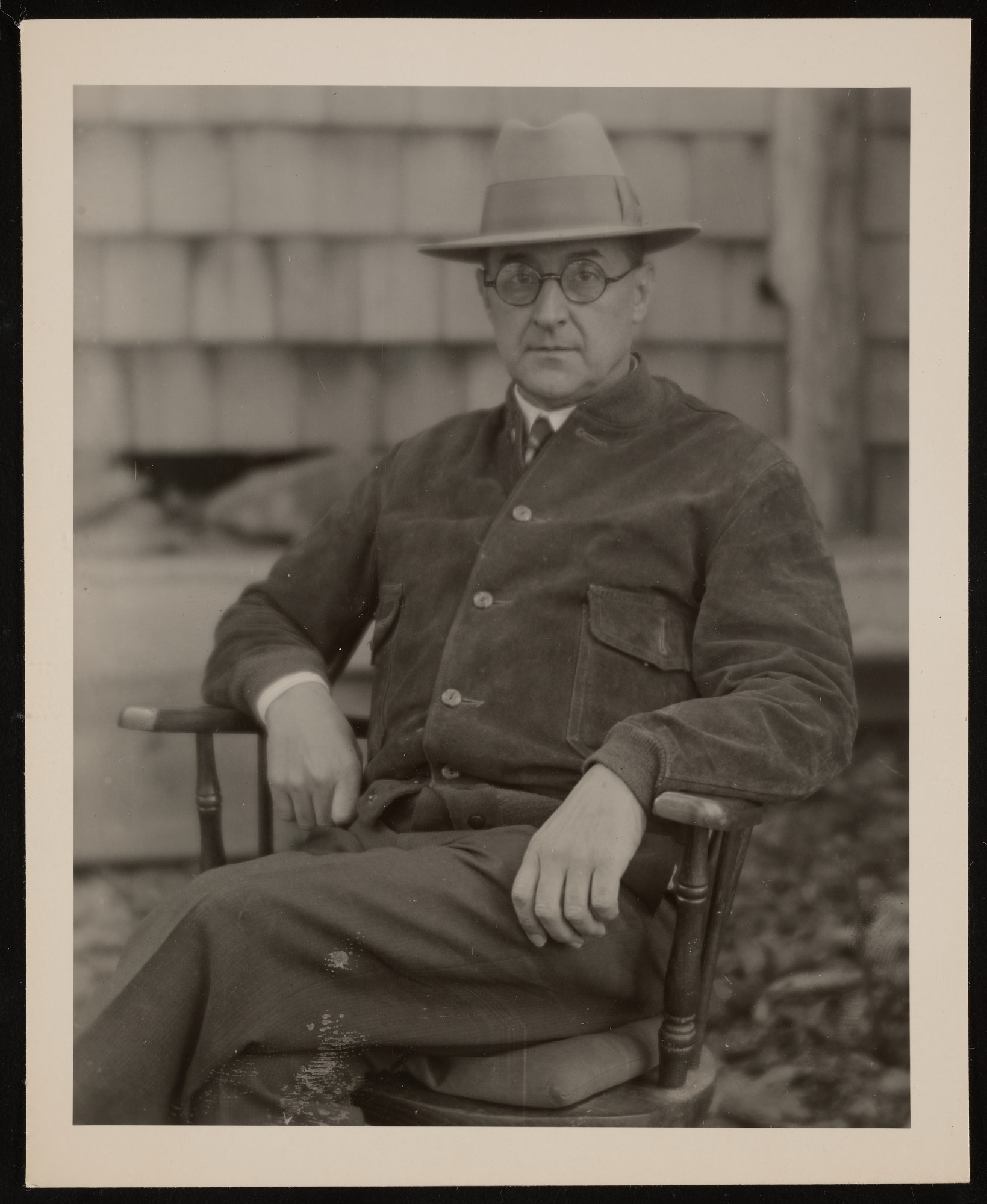 Seated outside of Winnemana Lodge, a cabin and clubhouse constructed on Plummers Island for use by the Washington Biologists' Field Club.