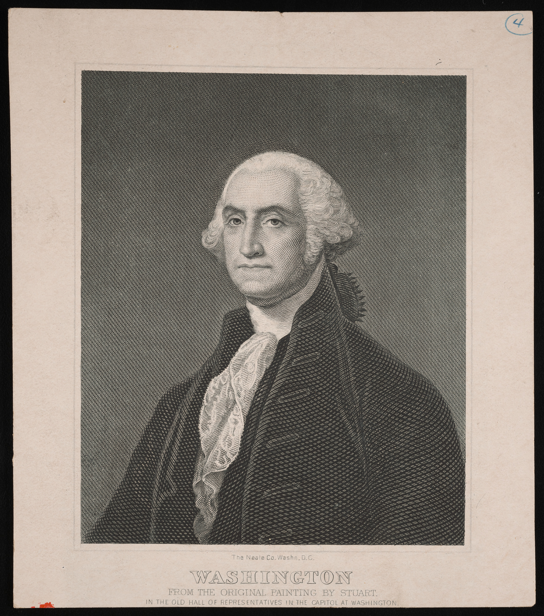 Printed on recto: The Neale Co. Washn, D.C. / Washington / From the Original Painting by Stuart. / In the Old Hall of Representatives in the Capitol at Washington.