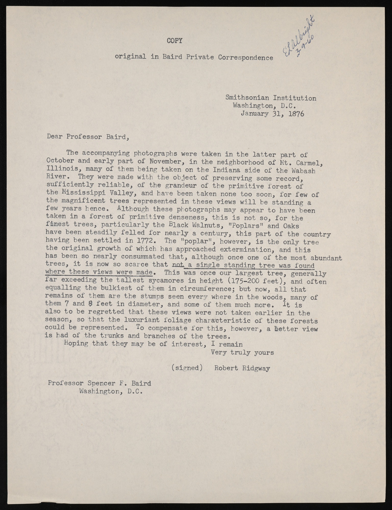 Copy of Letter from Robert Ridgway to Spencer Fullerton Baird, dated January 31, 1876