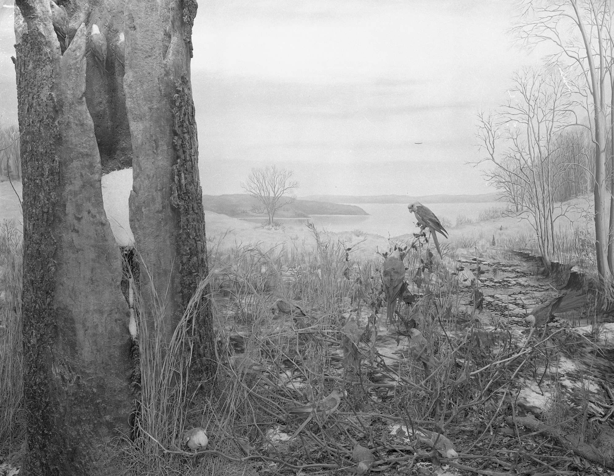 An exhibit case of birds shown in reproductions of their natural surroundings in Bird Hall. The exhibit opened in 1956 in the United States National Museum (USNM), now the National Museum of Natural History (NMNH), as part of the Exhibits Modernization Program.