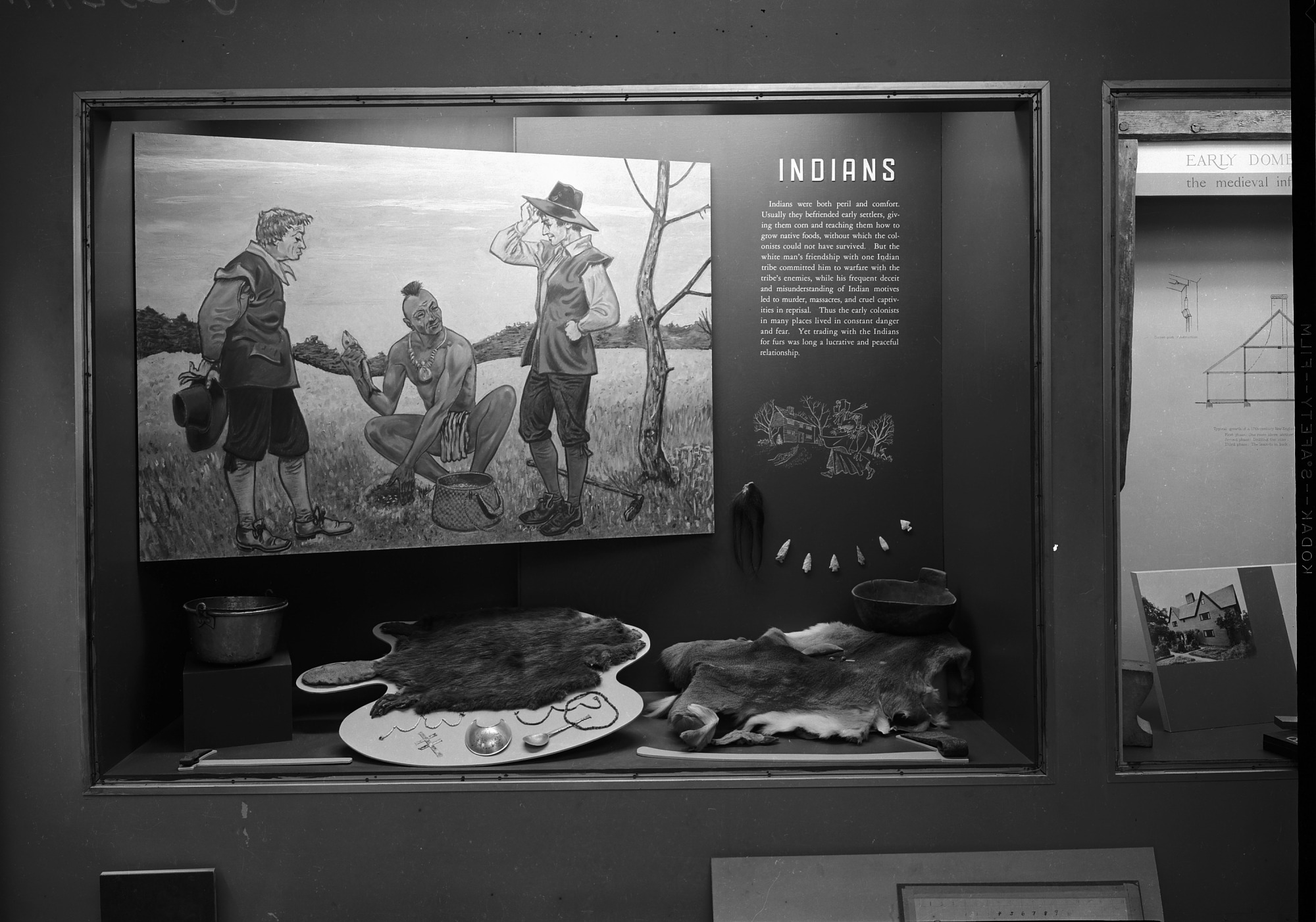 Anthropology Exhibit in the National Museum of Natural History. The case deals with interactions between early settlers and Native Americans. Two animal skins are in the bottom of the case along with several other objects. The main focal point of the exhibit is a large drawing of a Native American man teaching two settlers how to plant corn. The exhibit caption discusses the difficulty early settlers had in establishing peaceful relations with Native American societies.