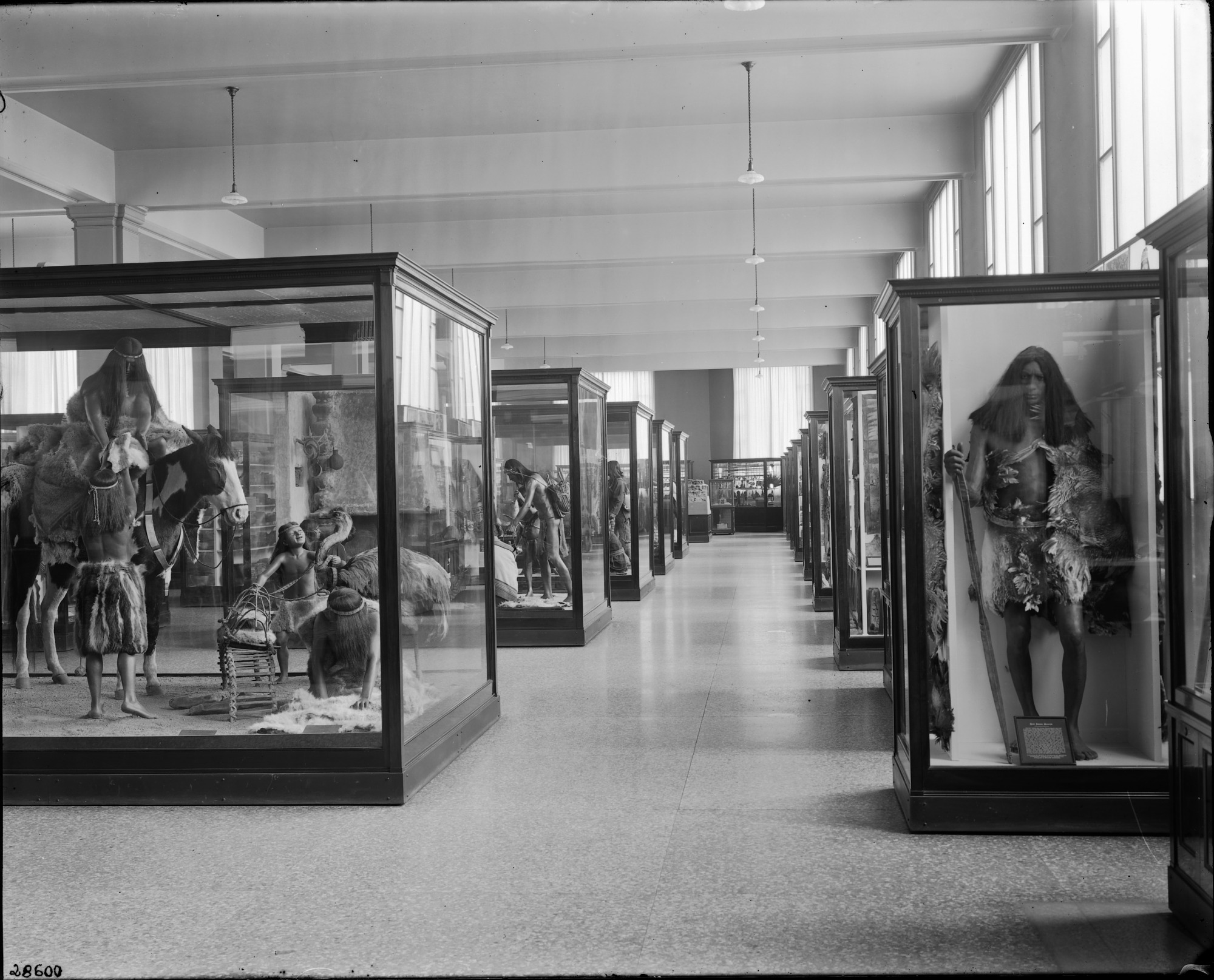 Two rows of exhibit cases showing life groups of Native Americans in the Anthropology Hall in the United States National Museum, now known as the National Museum of Natural History.