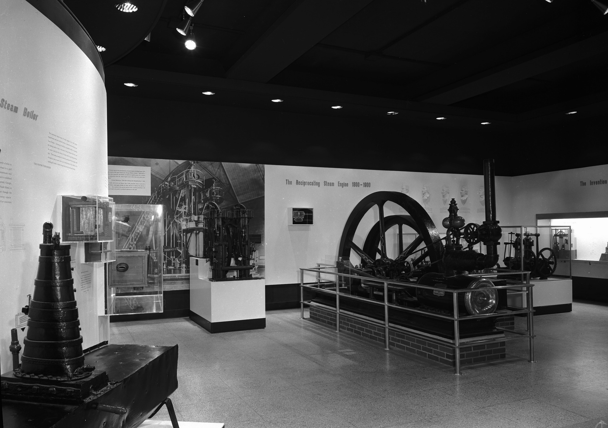 The Power Machinery Hall opened in 1957 in the Arts and Industries Building. This photo shows, from left to right, a John Stevens marine boiler (1804); a group of boiler models in wall cases; a large photo mural of 1400 hp Corliss engine from the Centennial Exposition in 1876; a Corliss beam pumping engine, c. 1880; a horizontal slide valve steam engine (1864); and a John Stevens boat engine (1804).