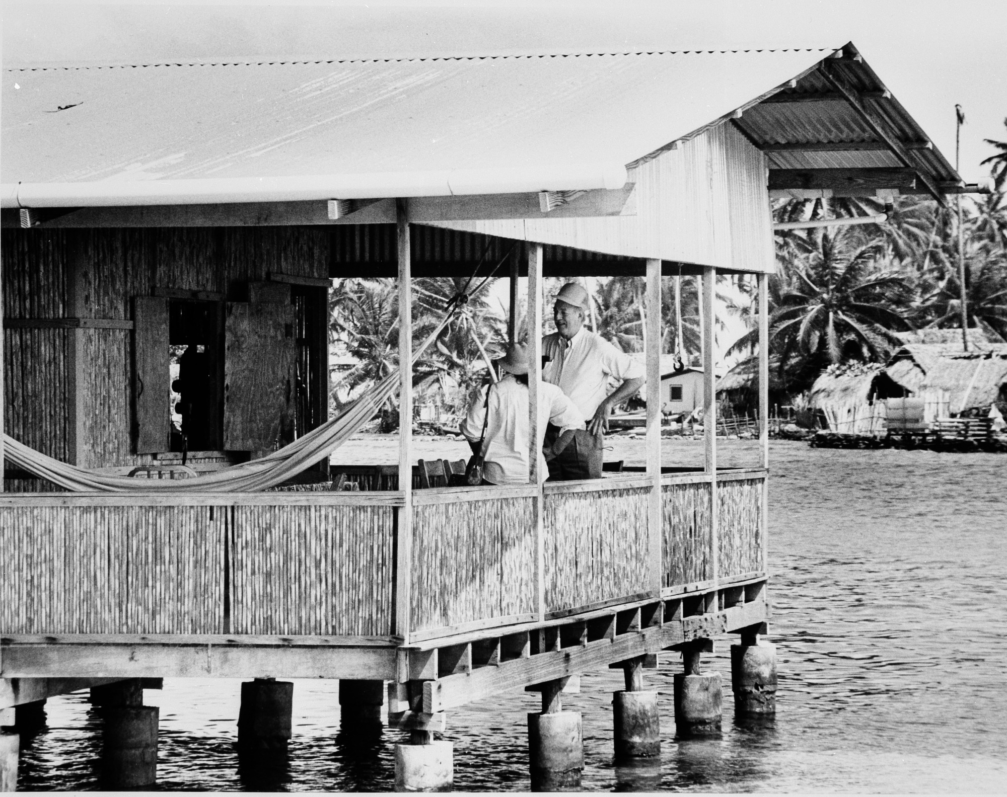 Robert McCormick Adams (1926-), ninth Secretary of the Smithsonian Institution (1984-1994), an anthropologist, on left, during a visit to the Caribbean marine station at the Smithsonian Tropical Research Institute in Panama on March 26, 1990. View shows building on stilts in water with shore visible in background. Adams is speaking with another individual.