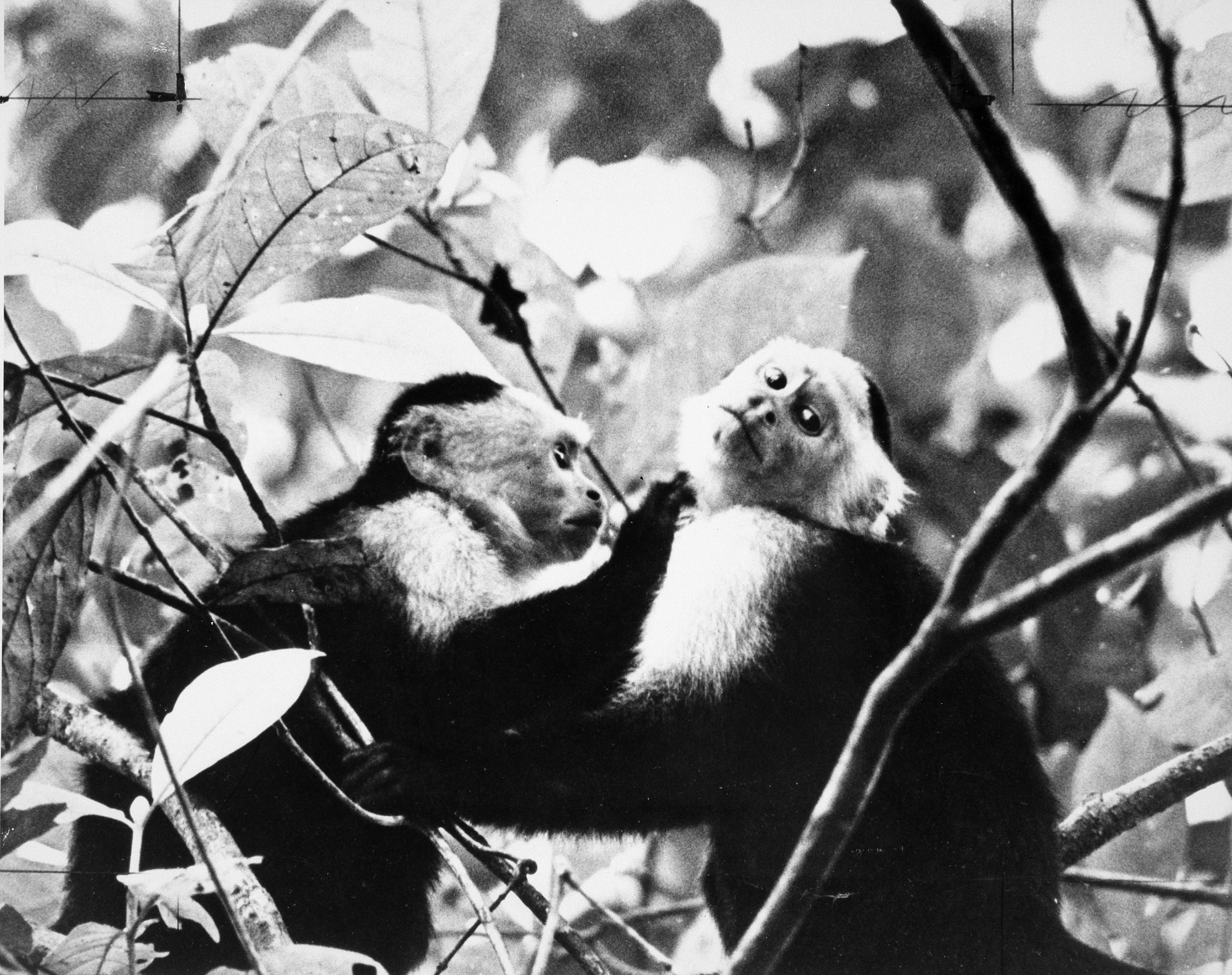 Two cebas monkeys are photogenic subjects in broad behavioral research at the Smithsonian Tropical Research Institute in Panama.