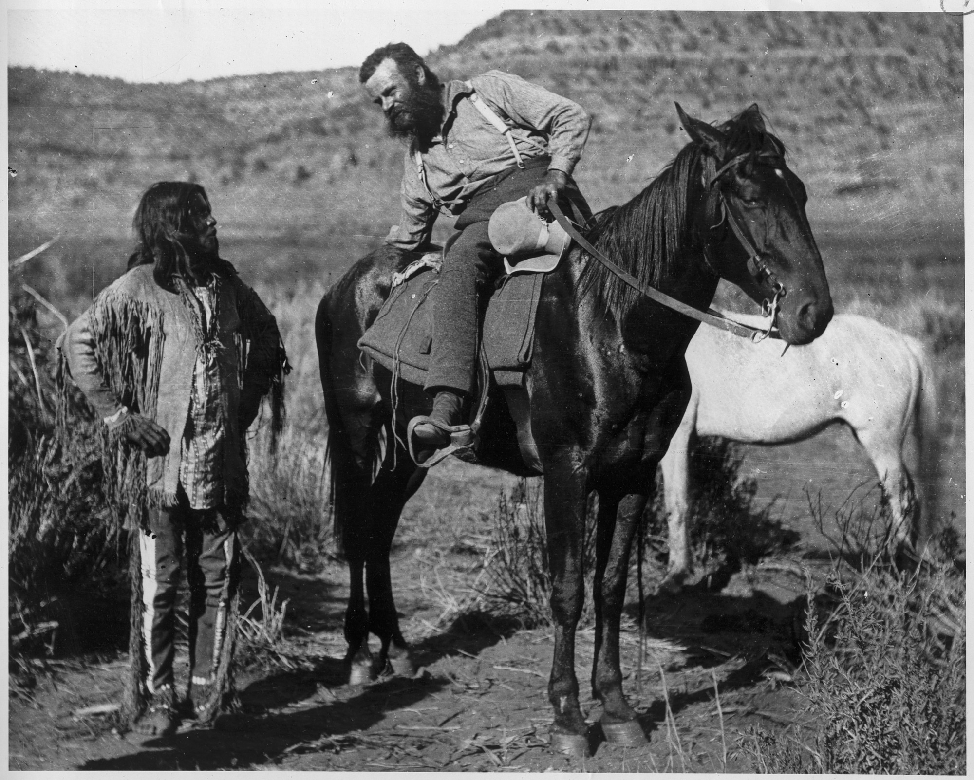 Major John Wesley Powell (1834-1902), seated on horseback and inquiring a Native American of the Paiute tribe, for the way to the water pocket at the Kaibab Plateau, near the Grand Canyon of the Colorado, in northern Arizona, while on one of his expeditions between 1871-1875. During his years as explorer and surveyor, John Wesley Powell made great efforts to gain the trust of the native Americans he came into contact. He compiled vocabularies, collected details of religion and lore of Indian peoples, and championed the rights of Native Americans. When Congress created the Bureau of Ethnology in 1879, Powell was named its first director (1879-1902), a post he held until his death.