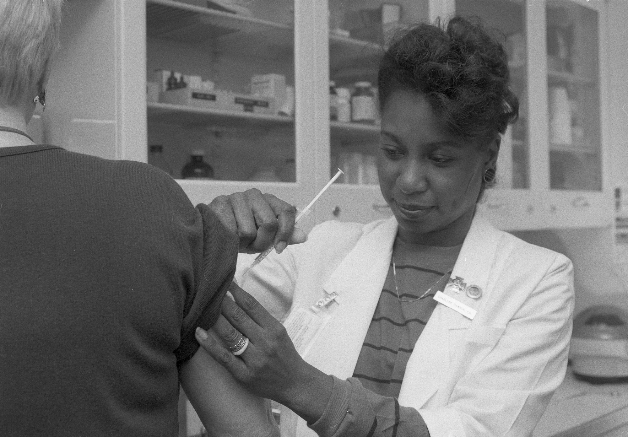 Health Services Nurse Charlene Dawson is shown here administering a free flu vaccination to a Smithsonian staffer.