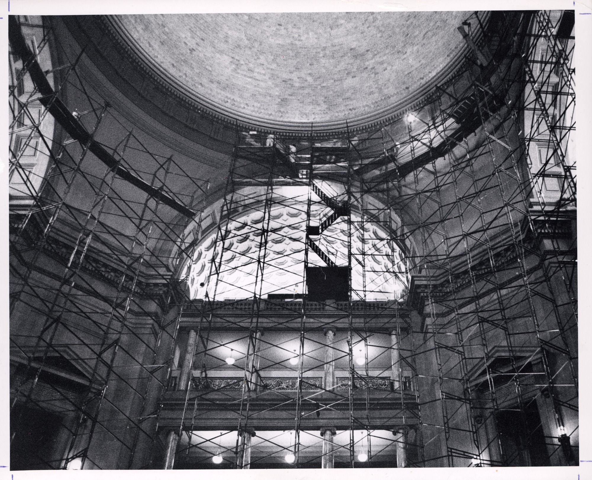 Scaffolding erected so workmen could scale the heights to repair plaster on National Museum of Natural History's (NMNH) rotunda dome. During renovation, visitors could still see the African bush elephant from the edges of the blocked-off rotunda floor or from a balcony above. For protection, the popular pachyderm was temporarily housed in an enclosure swathed in plastic.