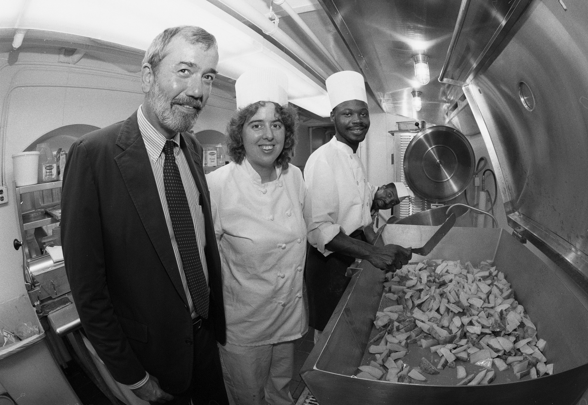 Concessions Administrator Roland Banscher, Executive Chef Barbara Hartman, Chef Terrance Grier and Cook Gregory Williams snatched a moment from a hectic morning to pose for this photo during lunch preparation for the 300 people who were about to descend on the newly reopened Commons.