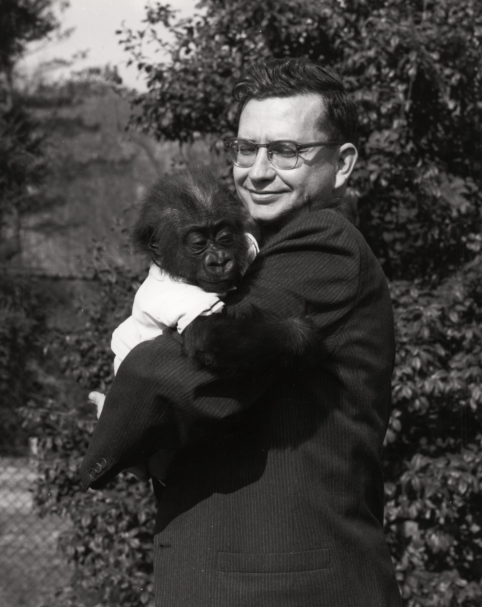 NZP Director Theodore Reed holds baby gorilla Tomoka, March 20, 1962. This was the second gorilla born in captivity in the United States.