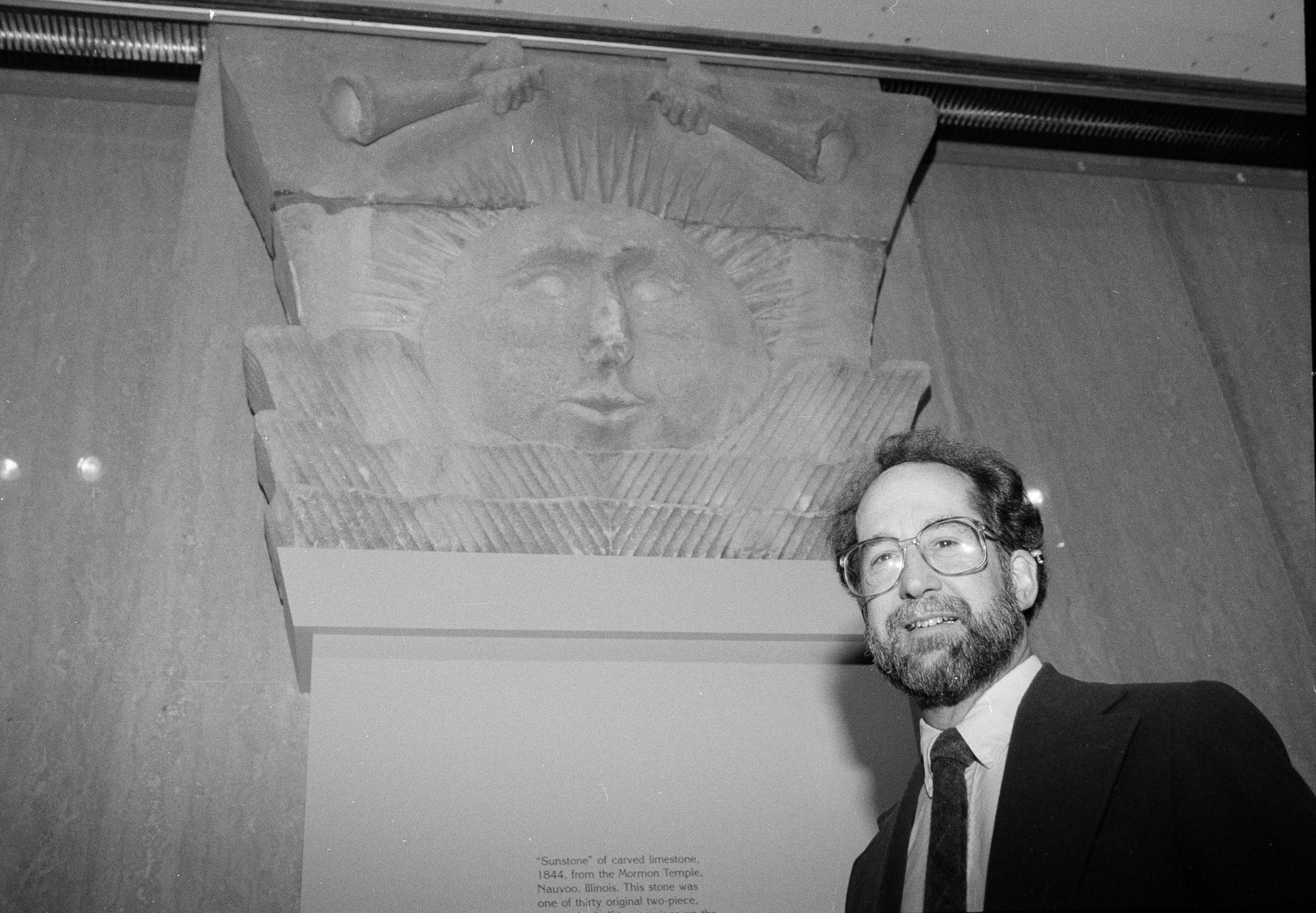Community Life Curator Richard Ahlborn poses in the National Museum of American History's (NMAH) Mall-side lobby with newly resplendent 2.5-ton "Sunstone." The striking sculpture face atop the pilaster was carefully restored by conservators in NMAH's Division of Conservation and at the Conservation Analytical Laboratory. The sculpture was for many years on display on the grounds of the Governor Wood Mansion, Quincy, Illinois. "Sunstone" was originally one of 30 identical faces capping sturdy pilasters on a Mormon temple built 1845 in Nauvoo, Illinois, and only three years later burned. There were also a "Moonstone" at the foot of each pilaster and a "Starstone" above each pilaster. These celestial designs are said to have come in a dream to Joseph Smith, founder of the Church of Jesus Christ of Latter-day Saints.