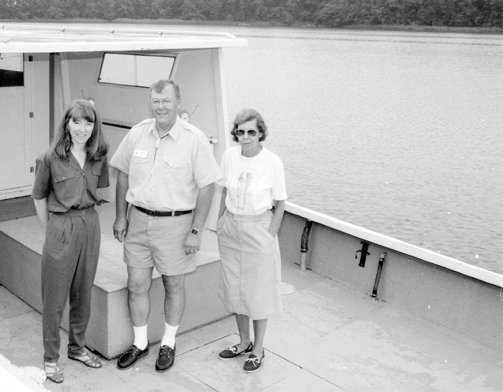 Volunteers Brenda Chapin, left, Ed Grimes and Gretchen Seilstad pose aboard the Smithsonian Environmental Research Center's (SERC) research vessel, the Robert Lee Forrest. Assisting in the study of physical, chemical and biological interactions in estuarine and water-shed systems, SERC volunteers can find projects at dockside, on the water or in the woods surrounding the center. Chapin and Seilstad have worked on many forest projects such as a forest-mapping project. Grimes captains the SERC's research vessel "Robert Lee Forrest", helps with dock activities, and guides groups on woodland walks.