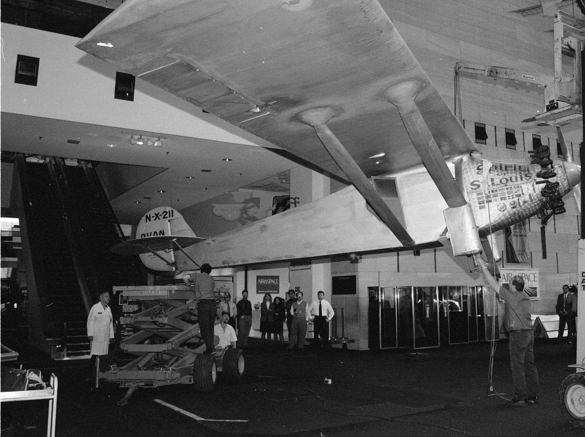 The "Spirit of St. Louis," aloft in the Milestones of Flight gallery in the National Air and Space Museum since 1976, is lowered for inspection and routine cleaning. The craft, with a steel tube fuselage and wooden wings, is covered in doped cotton and weighs about 2,150 pounds.