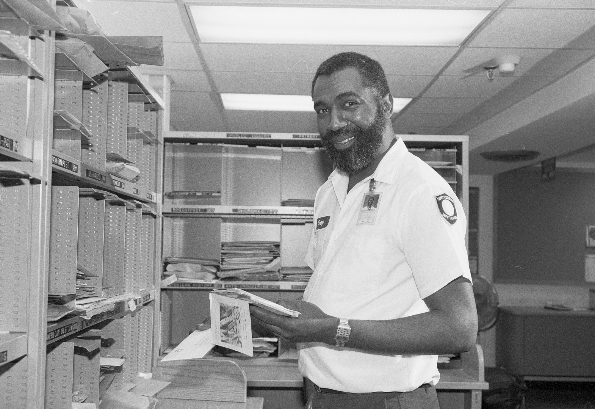 George Gray sorting mail in the Central Mail Room of the Mail Services Branch located near the west loading dock in the Natural History Building. Gray supervises a crew of mail clerks and mail leaders, who sort and deliver Smithsonian internal and external mail.
