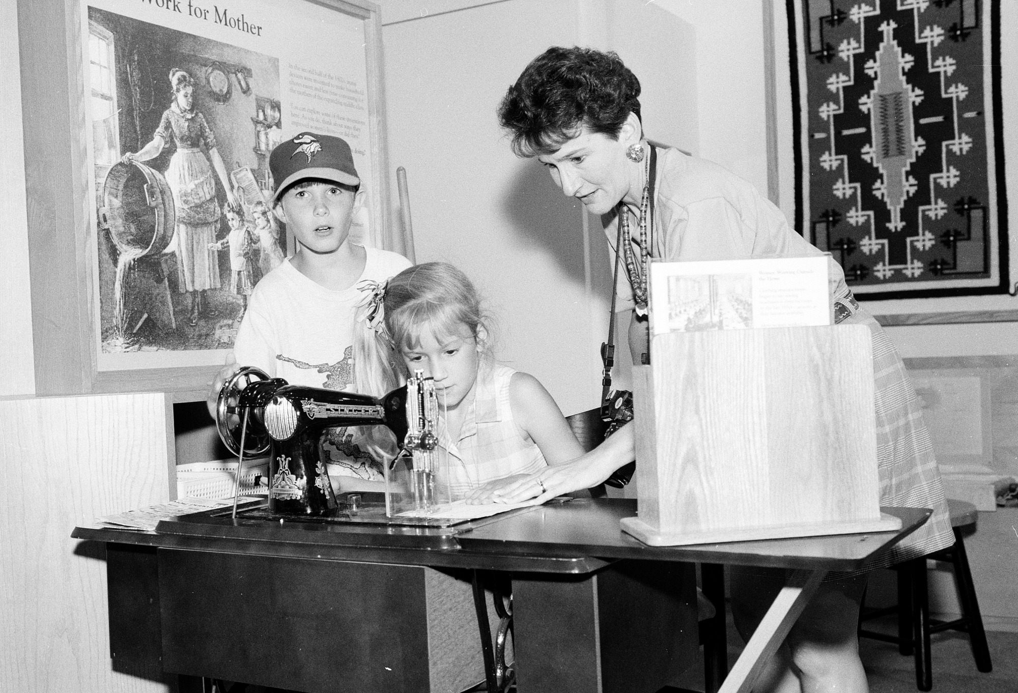 Visitors work at a sewing machine in the "More Work for Mother" section of the Hands on History Room in the National Museum of American History. The section relates to the late 19th- and early 20th-century work typically done by women.