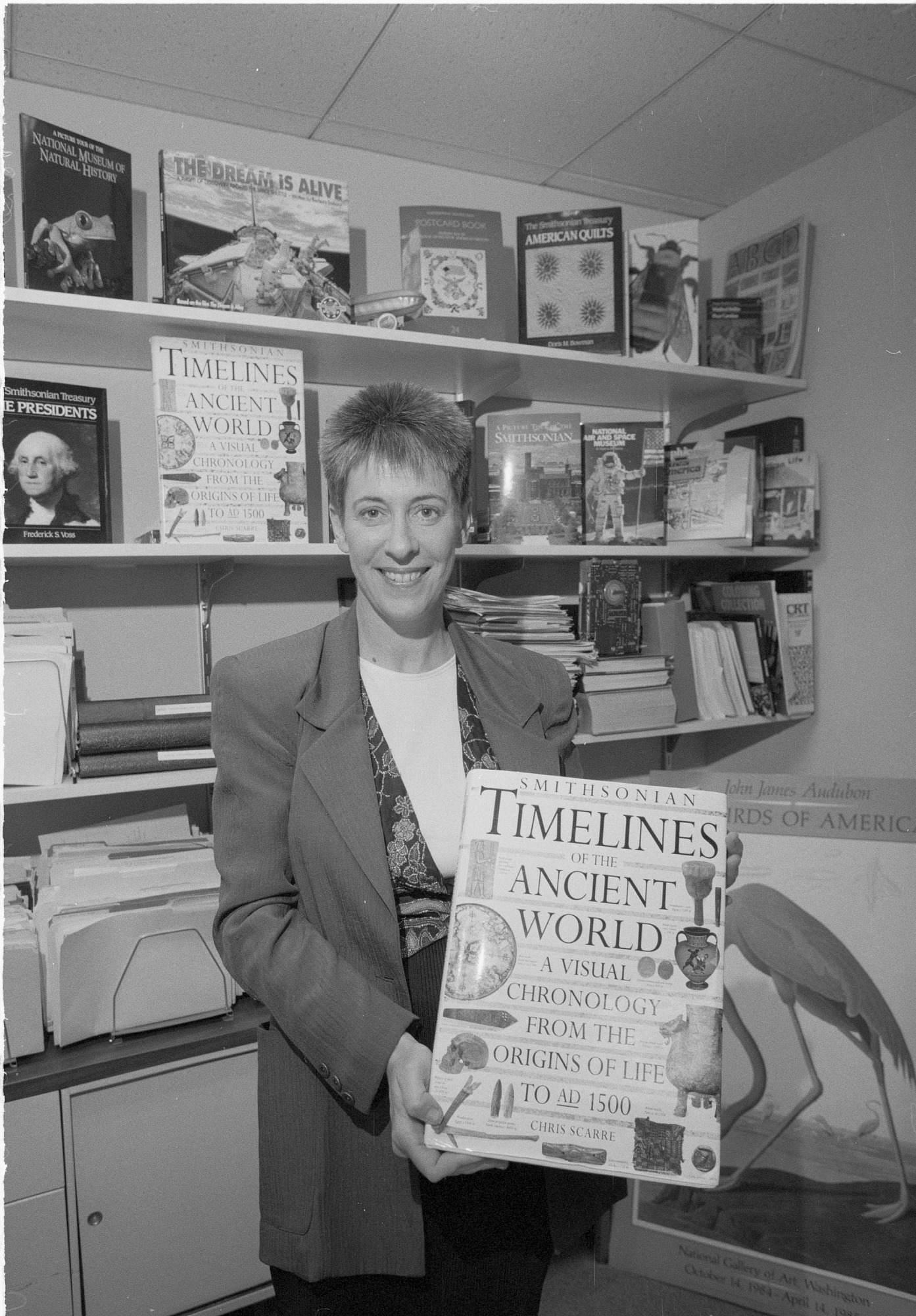 Caroline Newman, Executive Director of the Book Development Division of Smithsonian Institution Press, is pictured holding a new release "Smithsonian Timelines of the Ancient World: A Visual Chronology from the Origins of Life to A.D. 1500." The Book Development Division focuses its publications on popular adult and children's books directly related to the Smithsonian's collections.