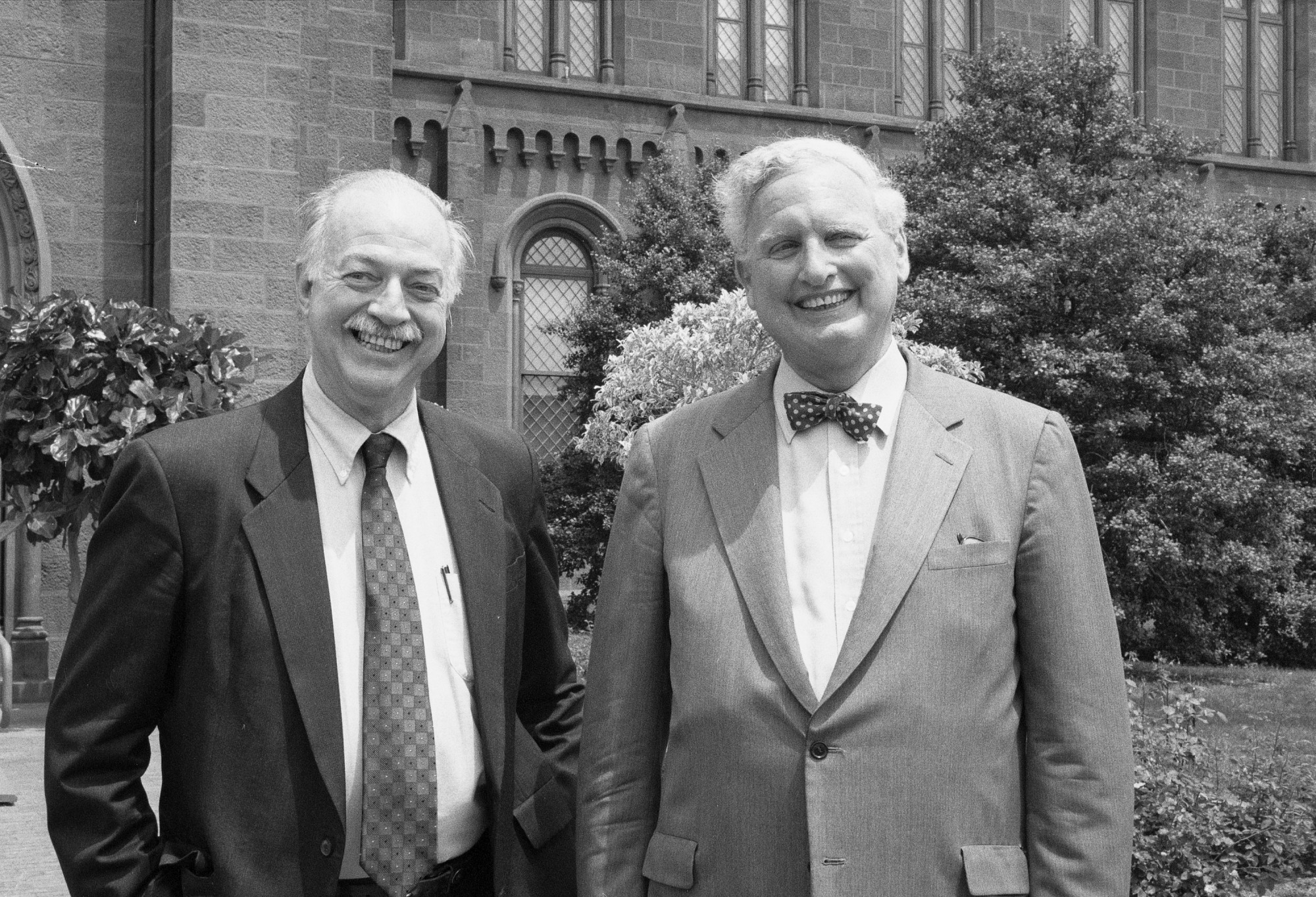 Ninth Secretary Robert McCormick Adams (1984-1994) with Secretary-Elect Ira Michael Heyman (1994-1999) in the Enid A. Haupt Garden after the May 25, 1994 press conference in the Smithsonian Institution Building announcing the "changing of the guard." Heyman came to the Smithsonian Institution from the Department of the Interior where he served as counselor to Bruce Babbitt Secretary of the Interior and deputy assistant secretary for policy. From 1980 to 1990 Heyman was chancellor of the University of California at Berkeley and is also former Smithsonian Institution regent.