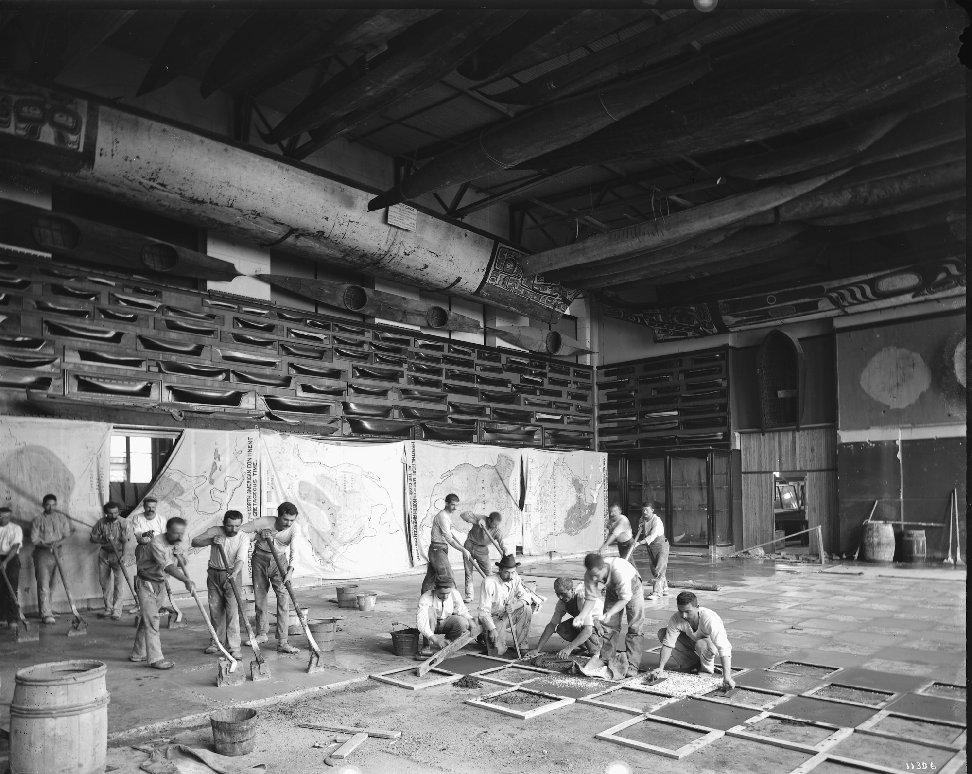 Laborers can be seen working on the laying of a new floor of marble and terrazzo, according to the Watkins' system, in one of the Northeast Range of the United States National Museum, now the Arts and Industries Building. The lower half of the Water Transportation exhibit is covered for protection. On the upper half of the wall models of boats can be seen. Canoes can also be seen hanging from the ceiling.
