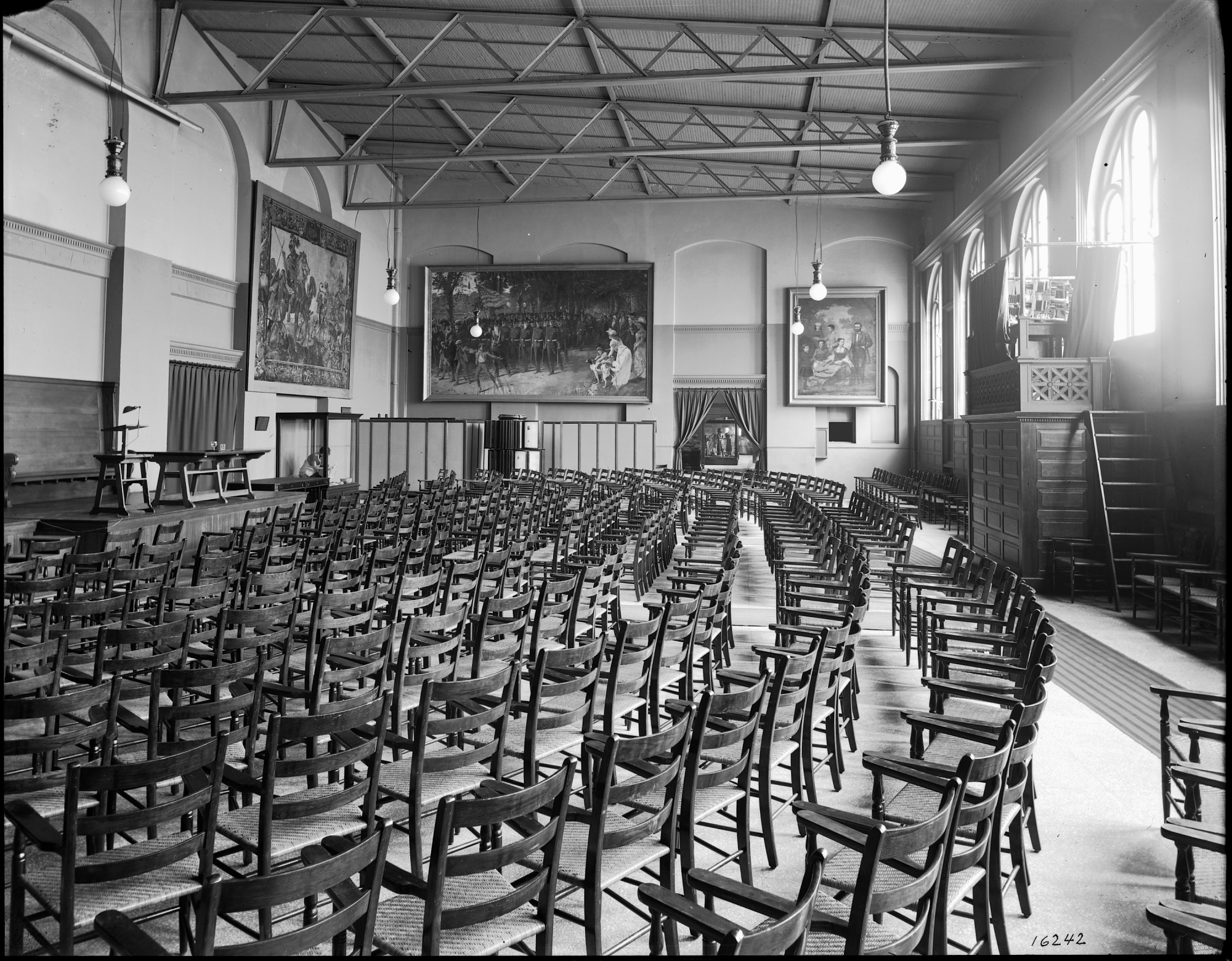 Lecture Room in the northeast Range in the United States National Museum, now the Arts and Industries Building. The chairs are set up in rows and there are three large paintings on the walls.