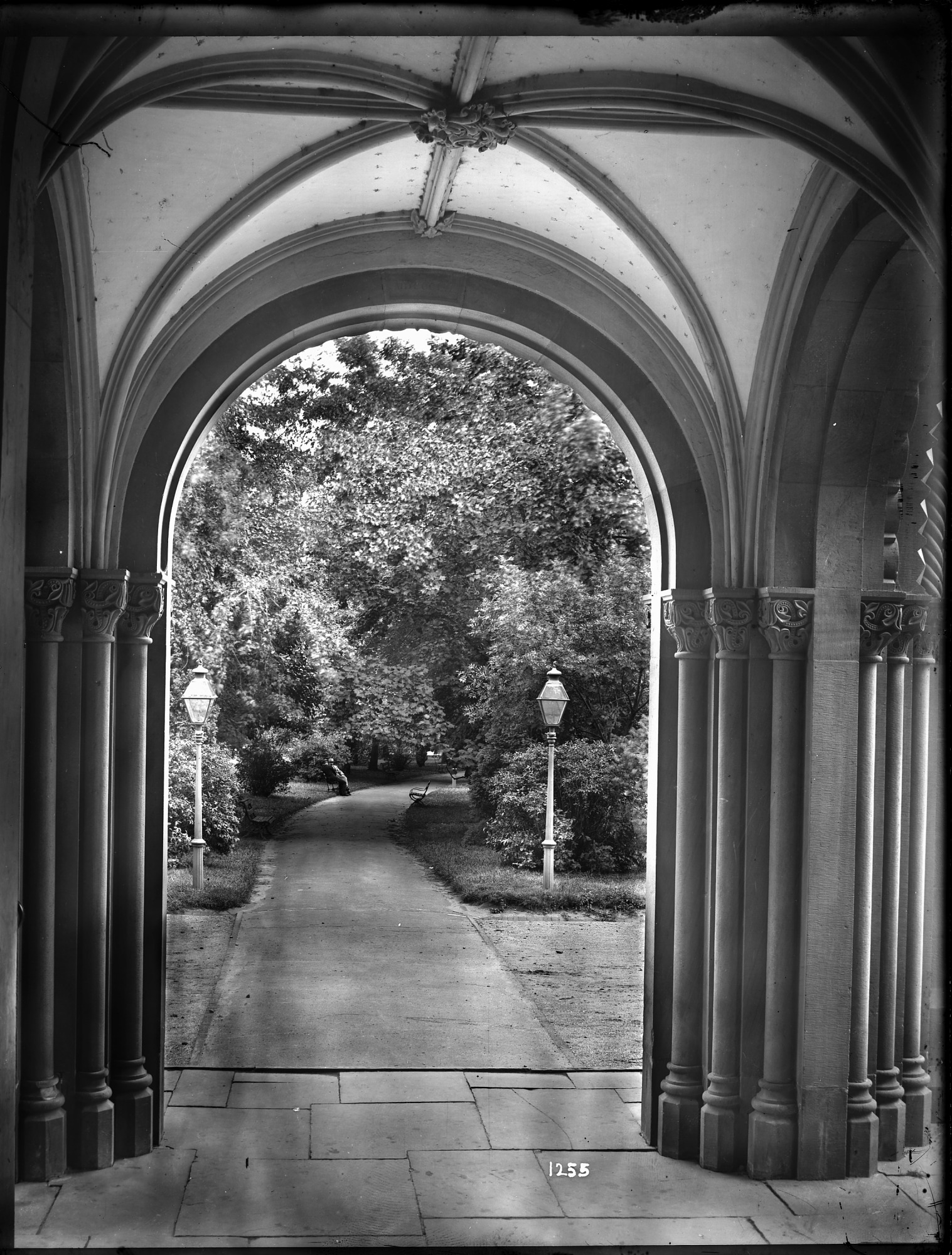 View is looking out at the section of The Mall known as "Smithsonian Park," from the North Carriage Porch of the Smithsonian Institution Building, late 19th century.