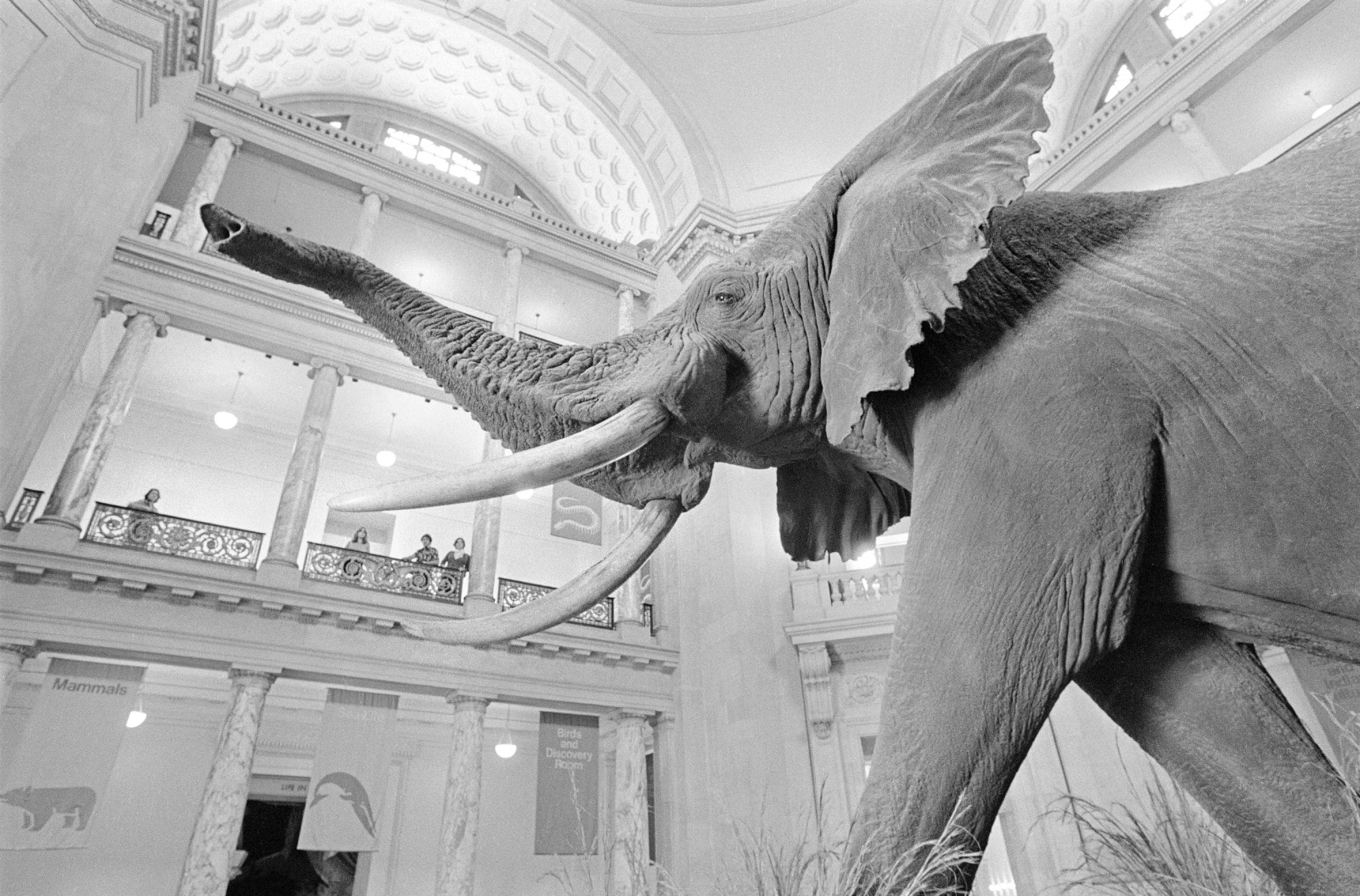 J. J. Fénykövi, a European big-game hunter, donated a 2-ton elephant hide to the National Museum of Natural History in 1958. William Brown, Smithsonian, chief taxidermist, and Norman Deaton mounted the exhibit after a tanner scraped and soaked the hide to make it thin and pliable. Brown observed the habits of elephants to create a scientifically accurate model of an elephant moving at a fast walk, trunk lifted and ears fanned out. The elephant was unveiled in the rotunda of Natural History in March 1959. View shows visitors on balcony of rotunda looking down on the elephant.