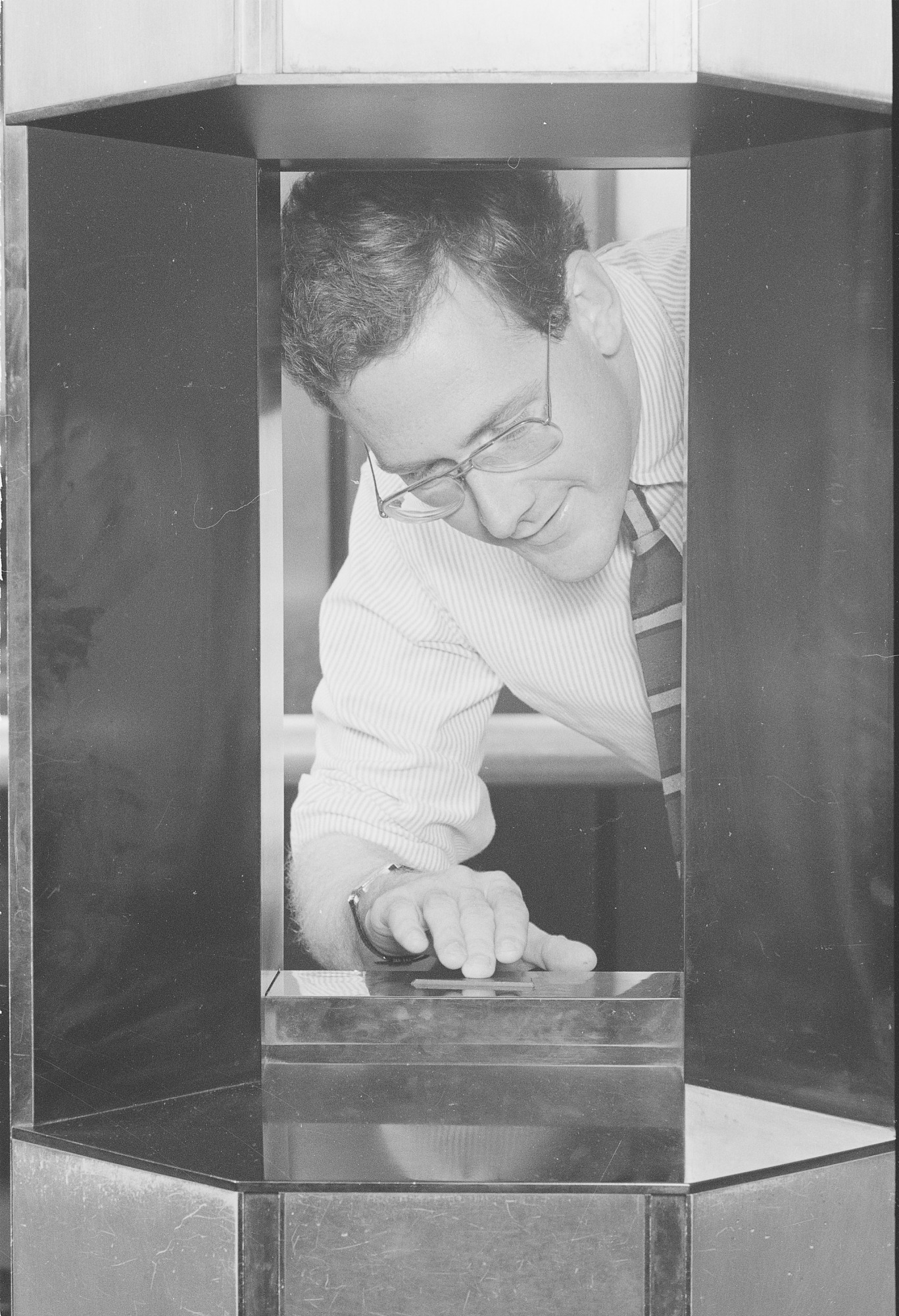 John D. Barrat, from the Office of Public Affairs, is touching the Moon Rock on exhibit in the National Air and Space Museum.