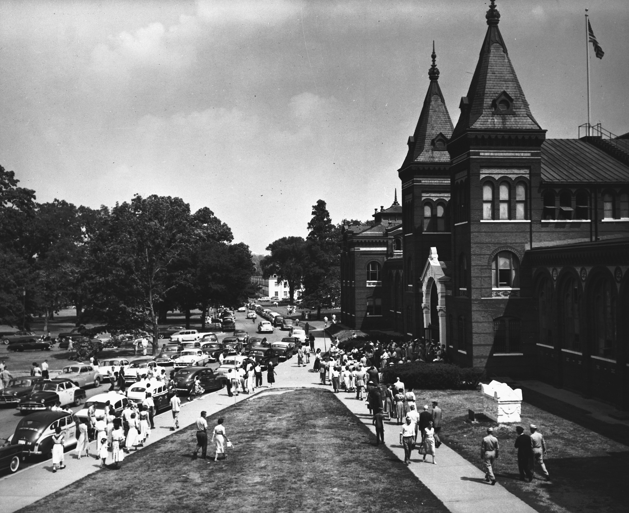 Crowds flock to the Arts & Industries Building (A&I) in the early 1950s after the Exhibits Modernization Program gave the history displays a new look. The "Syrian Sarcophagus" was brought into the country by a U.S. commodore who intended to give it to Andrew Jackson to be buried in. Jackson graciously refused the offer and the sarcophagus was eventually turned over to the Smithsonian and in May 1883 placed in front of the United States National Museum. Note the two-way traffic on the street in front of the building.