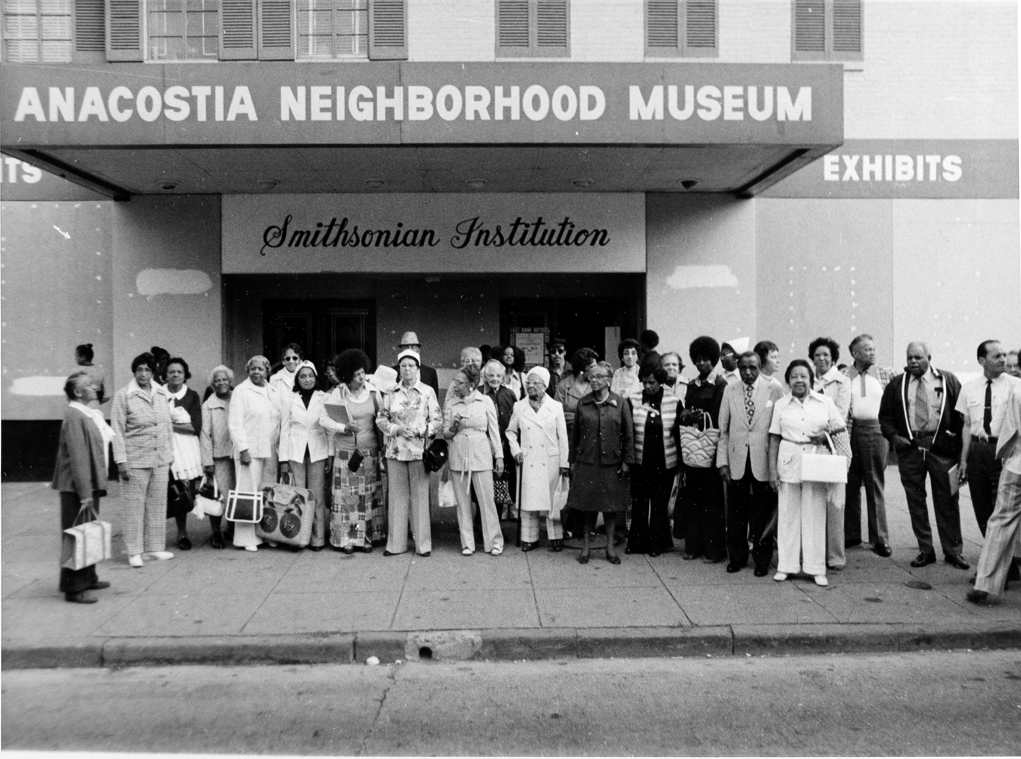 Anacostia Historical Society members pose in front of the Carver Theater, which served as the first home for the Anacostia Neighborhood Museum, now known as the Anacostia Community Museum. Louise Daniel Hutchinson, historian at the museum, is the seventh person from the left in the front row.