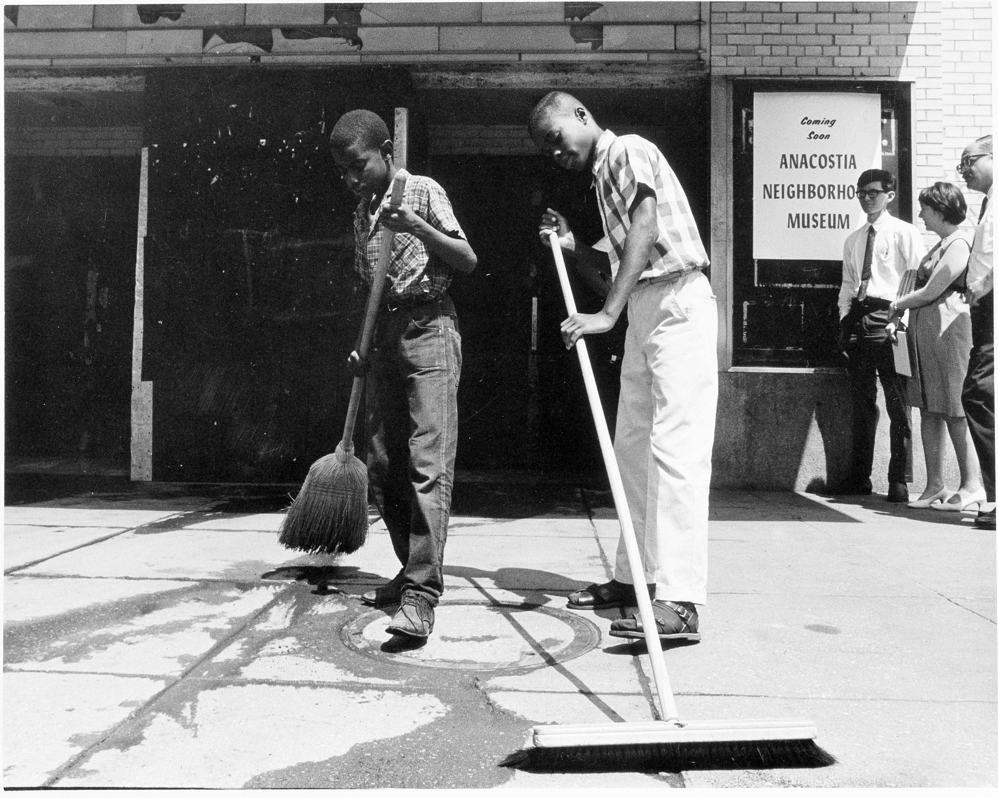Two boys sweep the entrance sidewalk in preparation for the opening of the Anacostia Neighborhood Museum located in the renovated Carver Theater on Martin Luther King, Jr. Avenue in Anacostia. The museum is now known as the Anacostia Community Museum and is located at 1901 Fort Place, S.E., Washington, D.C.
