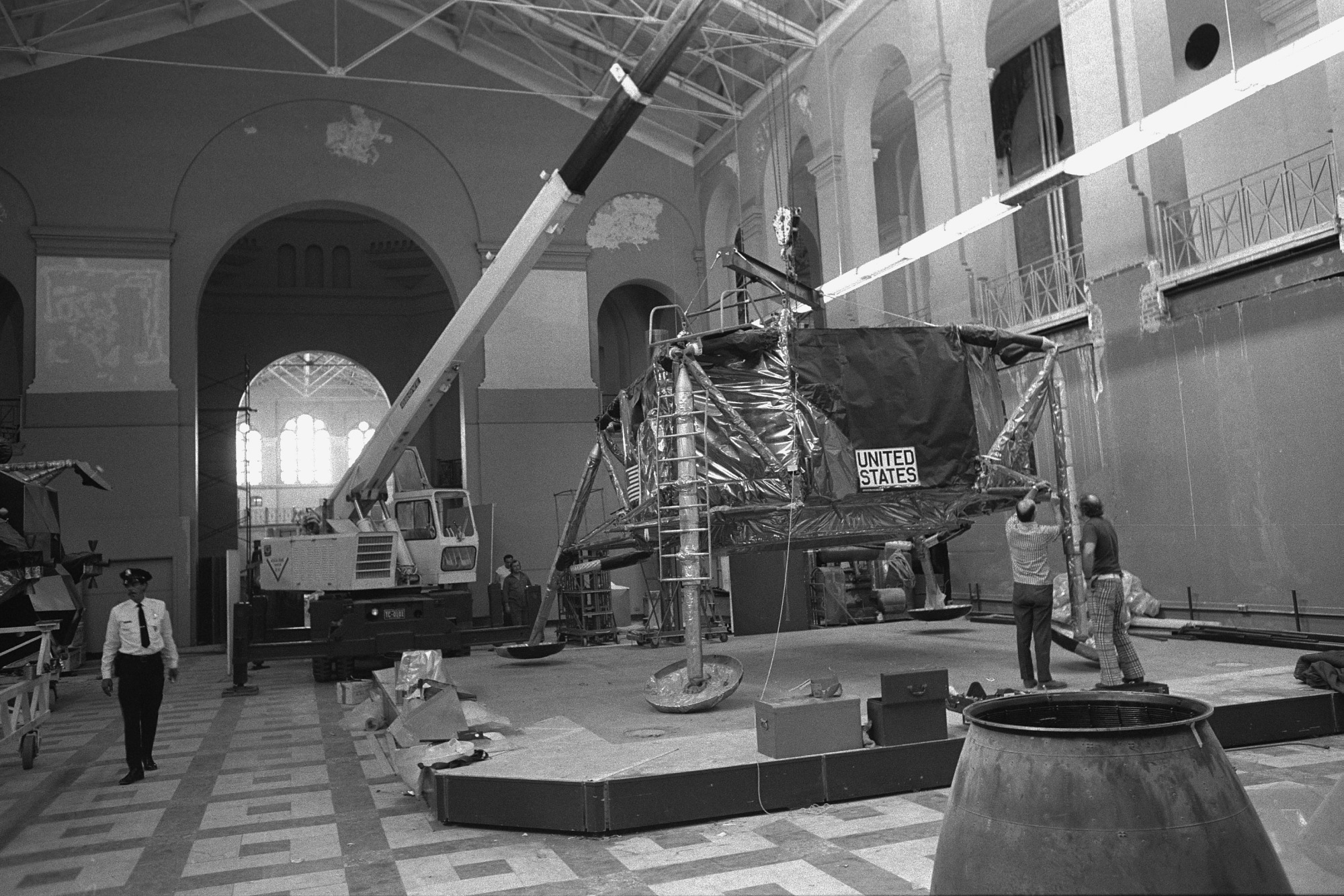 The bottom half of the Lunar Module being lifted off of the floor in the North Hall of the Arts and Industries Building so that it can be moved out of the building, August 18, 1975.