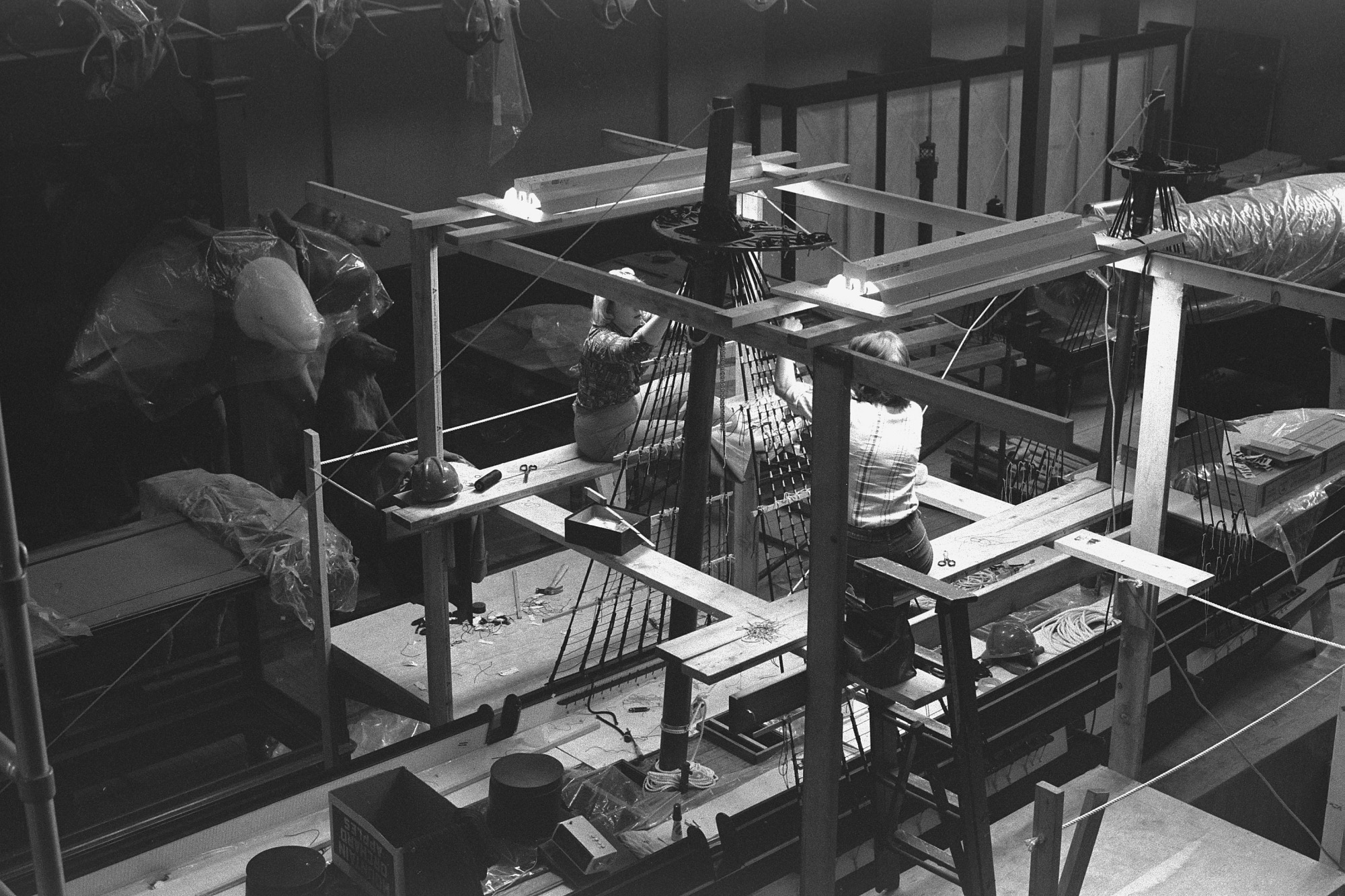 Two women installing the ship exhibit in the "1876: A Centennial Exhibition" in the Arts and Industries Building, February 26, 1976.