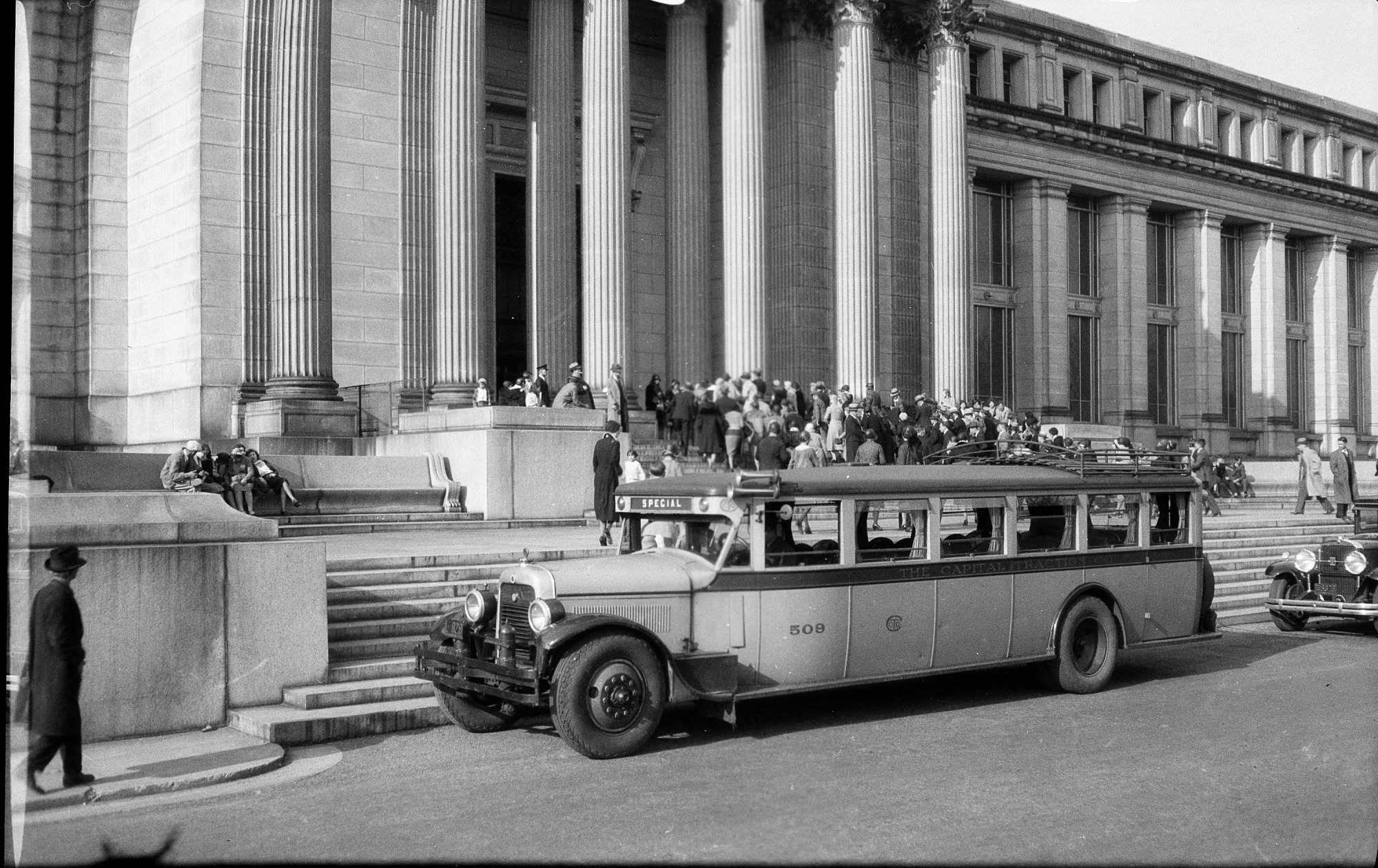 A bus dropping visitors at the south side of the Natural History Building, United States National Museum (now the National Museum of Natural History), Easter week, April 1931.