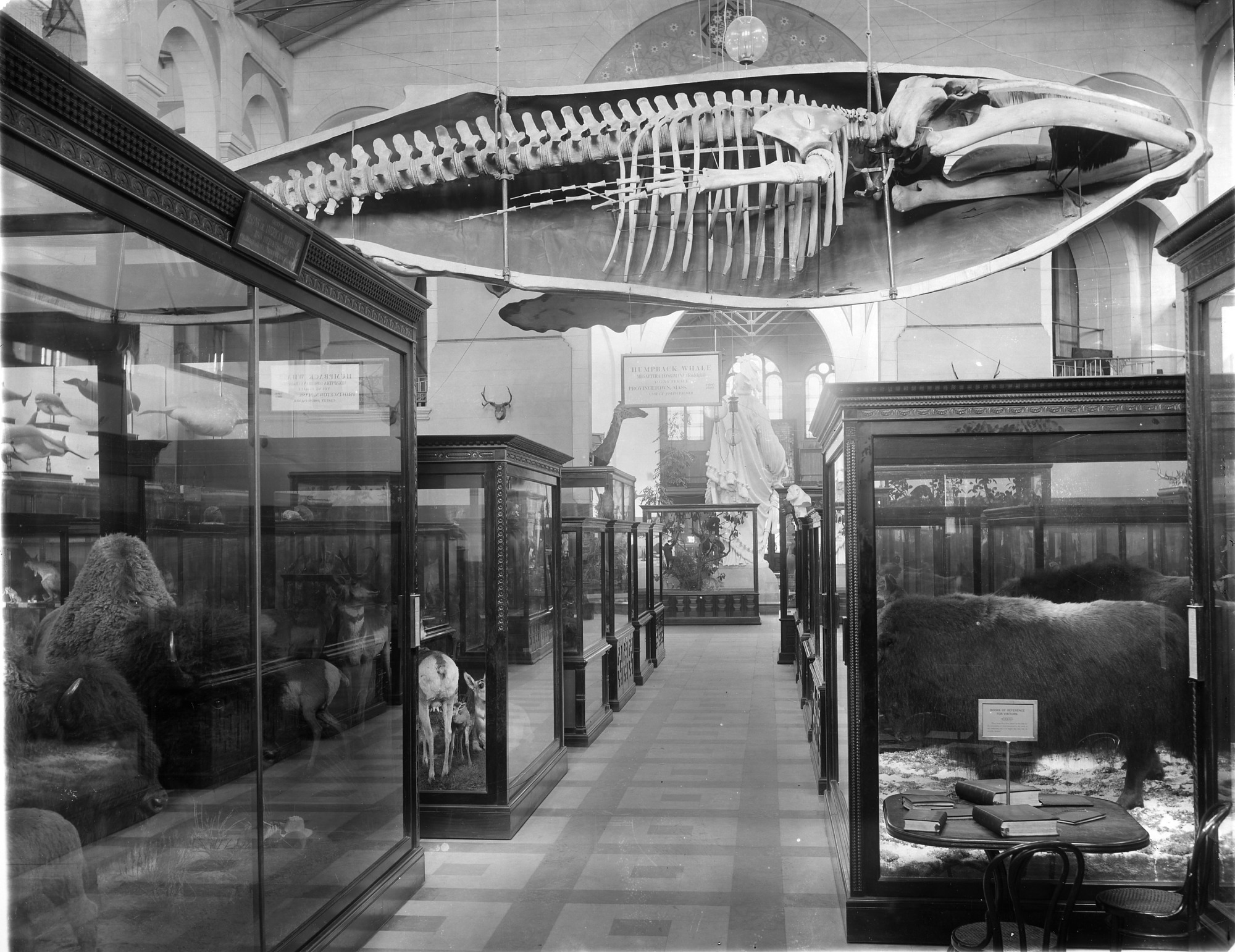 The Mammals exhibit in the South Hall of the United States National Museum, now the Arts and Industries Building. The skeleton of a humpback whale hangs from the ceiling, reference books are on a table in the foreground, and the back of the "Statue of Freedom" in the Rotunda is visible.