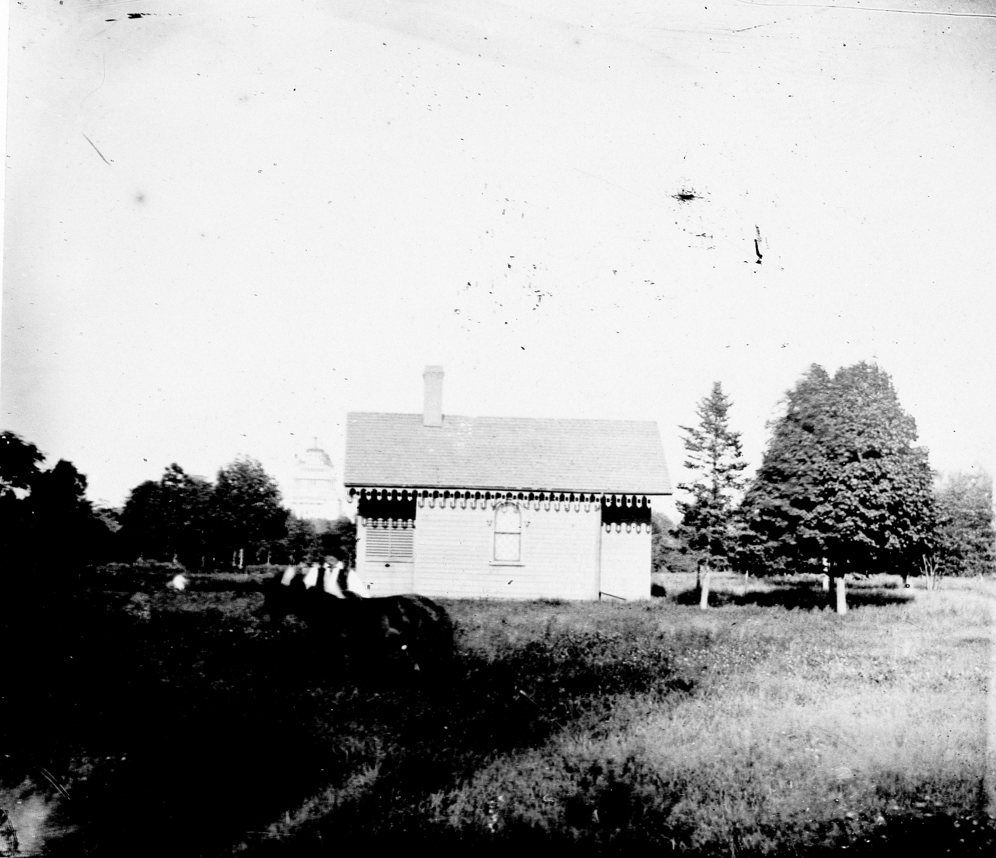 Garden shed on the grounds around the Smithsonian Institution Building. There is a man with a horse (which is quite blurry) in front of the building and the dome of the United States Capitol building can be seen in the background. The Arts and Industries Building is now on this site.