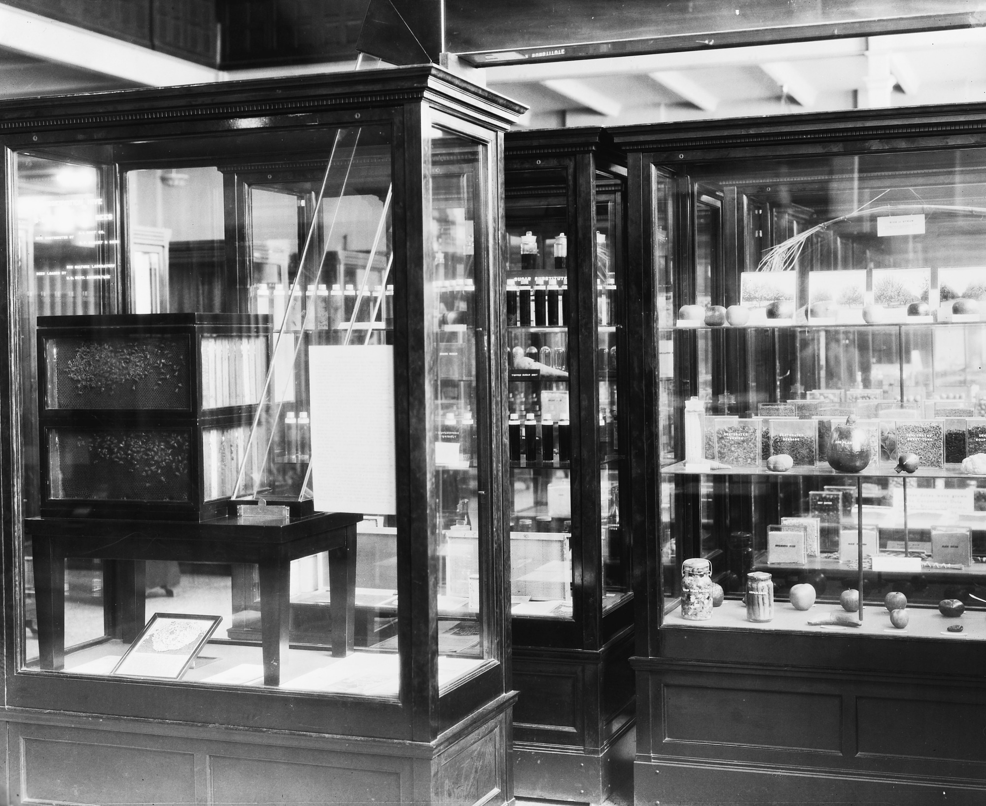 The food exhibit in the Comparative Technology section of the United States National Museum (USNM), now the Arts and Industries Building, displayed the raw materials of human foods from across the world, visible in the exhibit case to the right. The exhibit also included a living bee hive with bees, contained in the case on the left, borrowed from the United States Department of Agriculture.