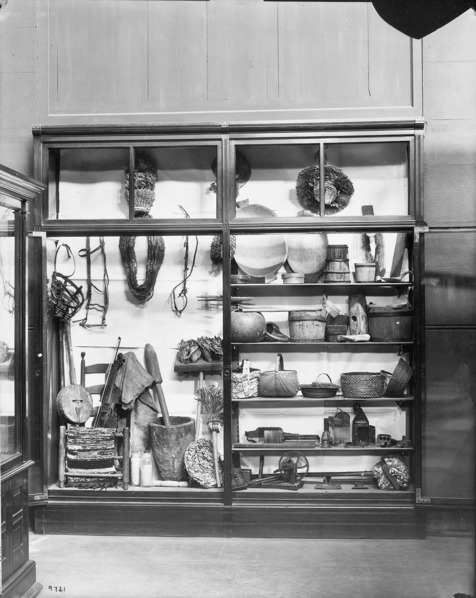Exhibit case in the Arts and Industries Building of domestic artifacts, possibly the Copp Collection of colonial life in America. Exhibited are basketry, musical instruments, furnishings, harnesses, and bowls.