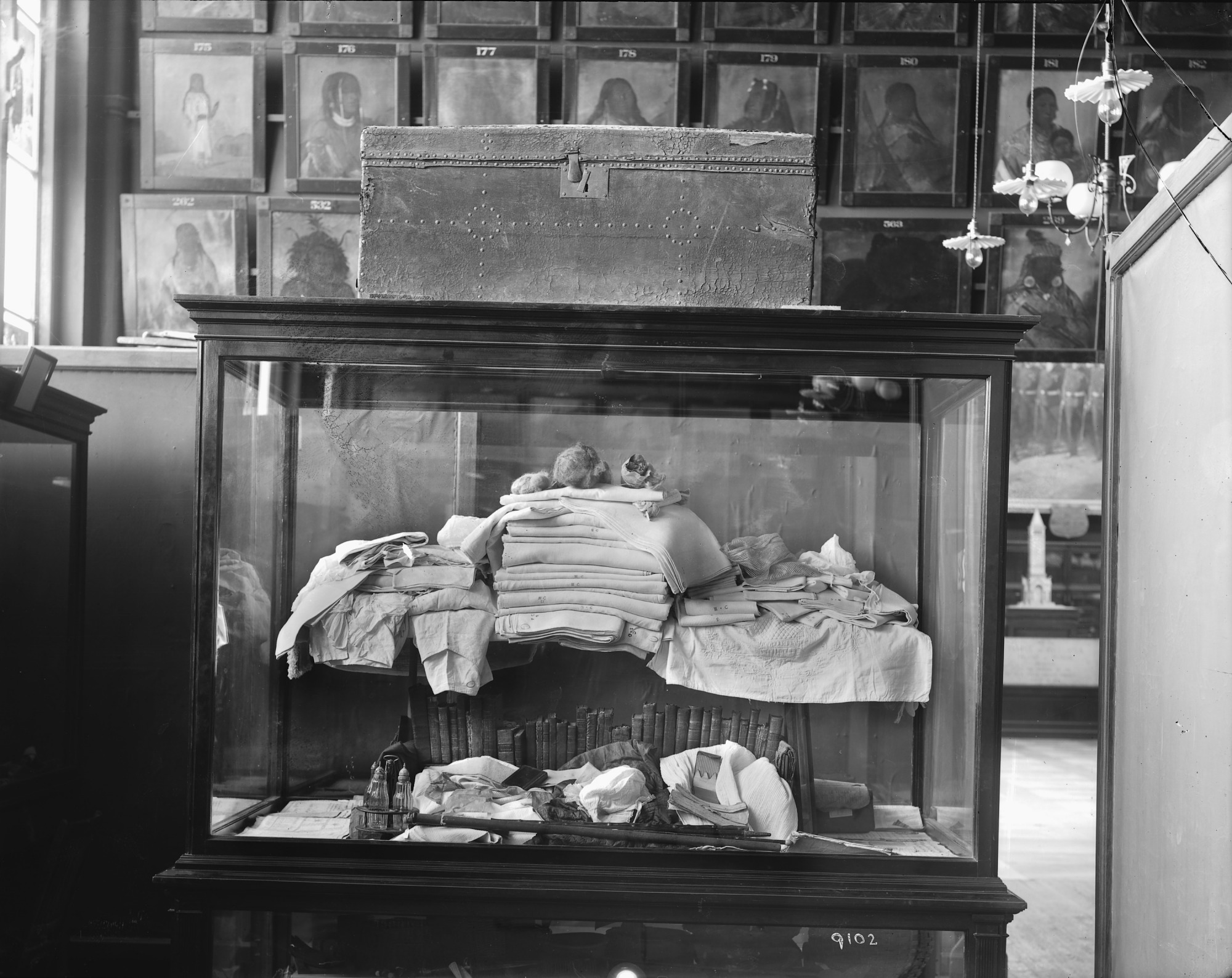 Exhibit case containing Colonial era linens and tableware from the Copp Family Collection on display in the Arts and Industries Building. Visible behind the exhibit case is the Catlin Indian Gallery.