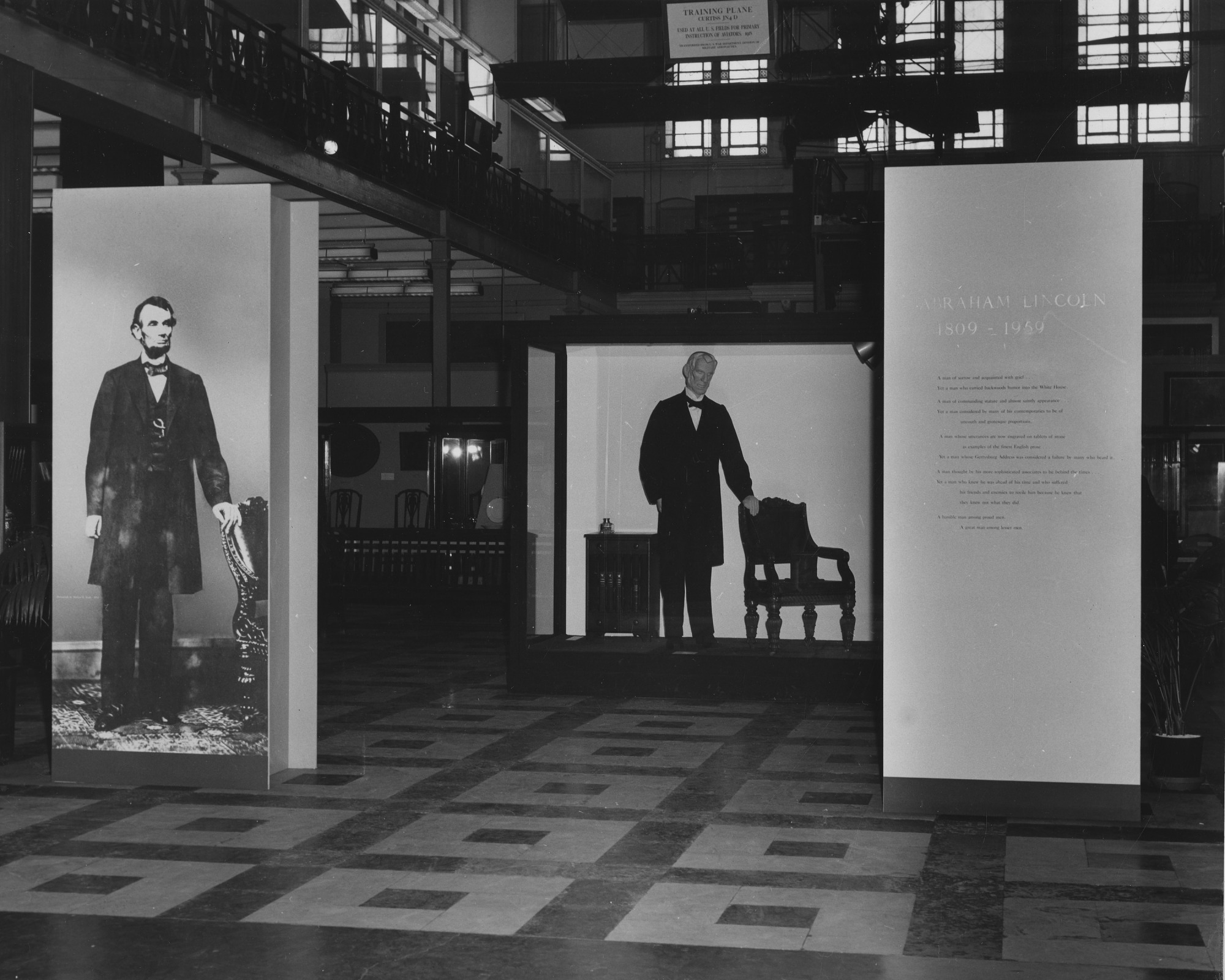 - An exhibit on Abraham Lincoln in the Arts and Industries Building celebrates the 150th anniversary of President Lincoln's birthday. On the left is a large photo of Abraham Lincoln with his left hand on the back of a chair. In the center, an exhibit case has a mannequin figure of Abraham Lincoln with his left hand on the back of a chair. An exhibit case in the left rear holds original objects.