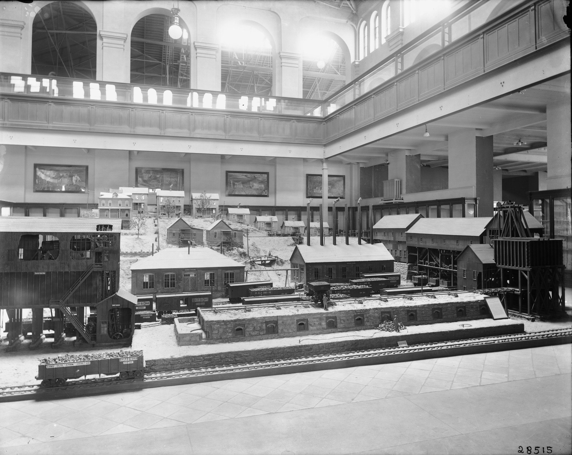 A model showing a mining town with railroad tracks in the foreground, various coal mining buildings, and houses in the background in the United States National Museum, now the Arts and Industries Building. This model shows the industry, transportation and community.