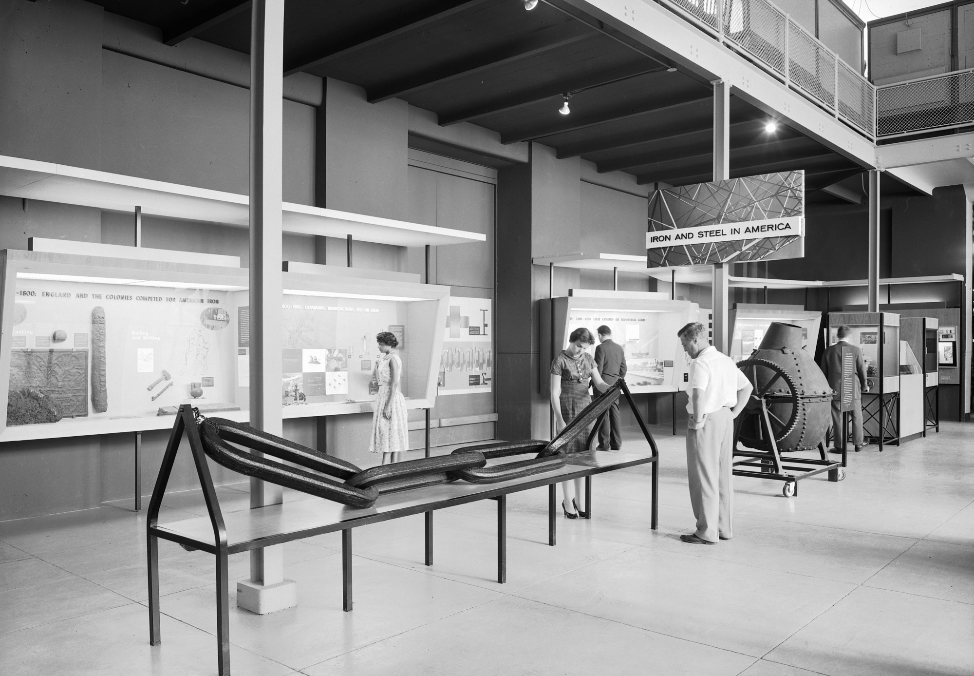 The "Iron and Steel in America" exhibition prepared as part of the Smithsonian's Exhibits Modernization Program in the 1950s. The exhibit was located in the United States National Museum (USNM), now the Arts and Industries (A&I) Building. Visitors are looking at gigantic chain links while others are looking at exhibit cases.
