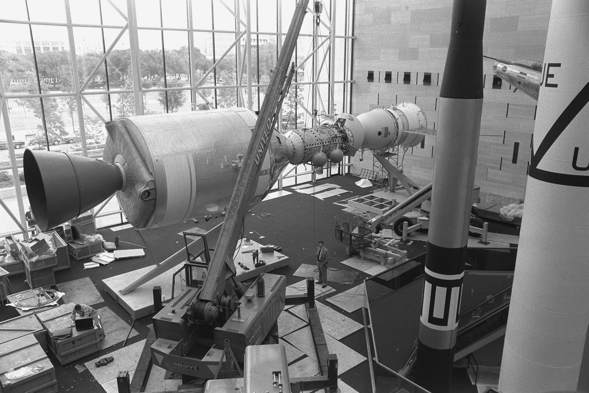 Installation of the Apollo-Soyuz space vehicles in the National Air and Space Museum before it is open to the public, May 24, 1976.