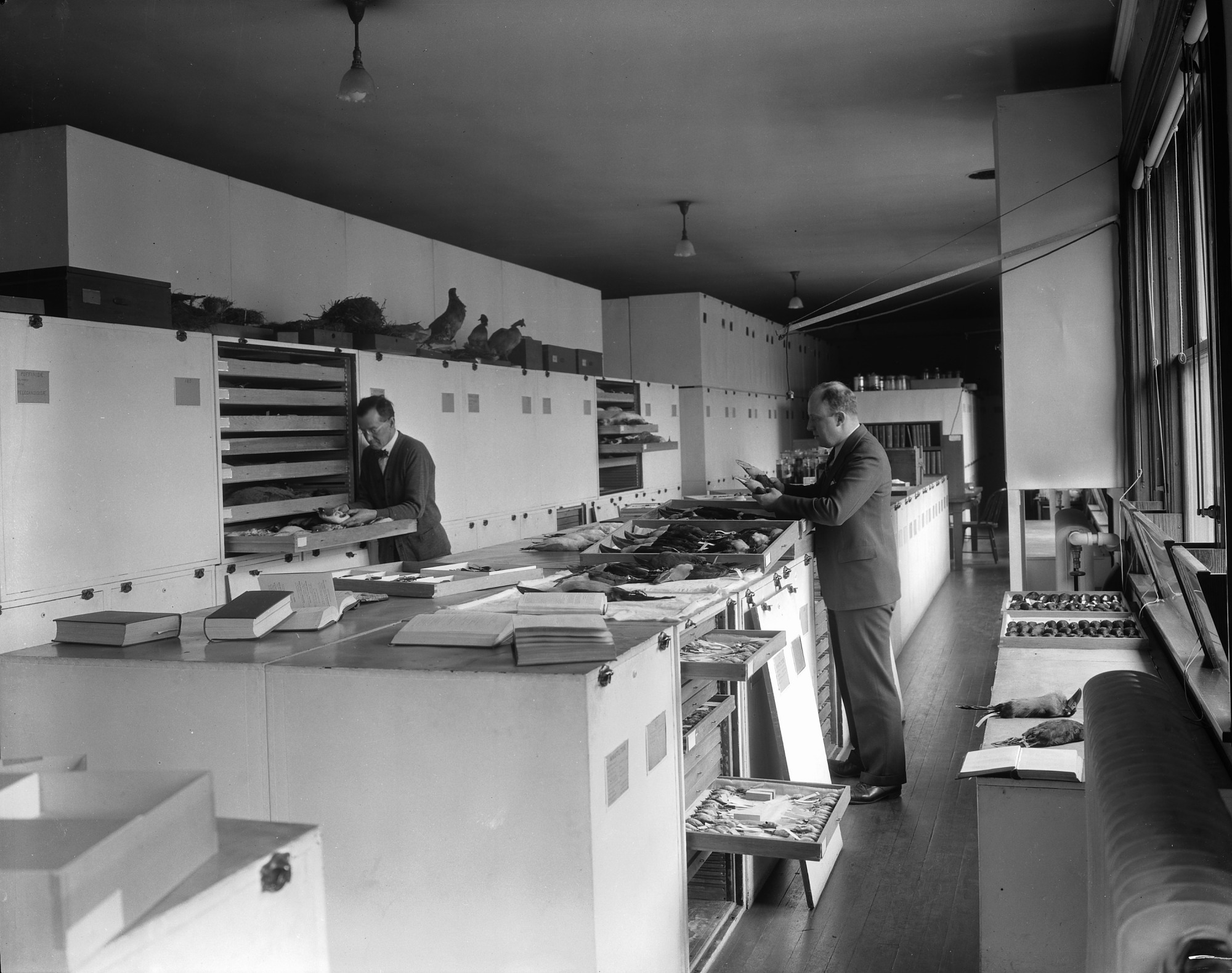 Dr. Herbert Friedmann (1900-1987) and Mr. J. H. Riley are at work in the bird specimen collection storage area. Friedmann was Curator of Birds, Department of Zoology, United States National Museum, now the National Museum of Natural History, from 1929 to 1961.