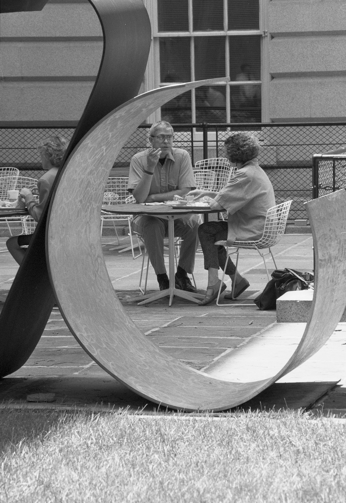 Two visitors enjoy lunch on a beautiful day in the courtyard of the American Art and Portrait Galleries' building, now the Smithsonian American Art Museum. A sculpture is in the foreground.