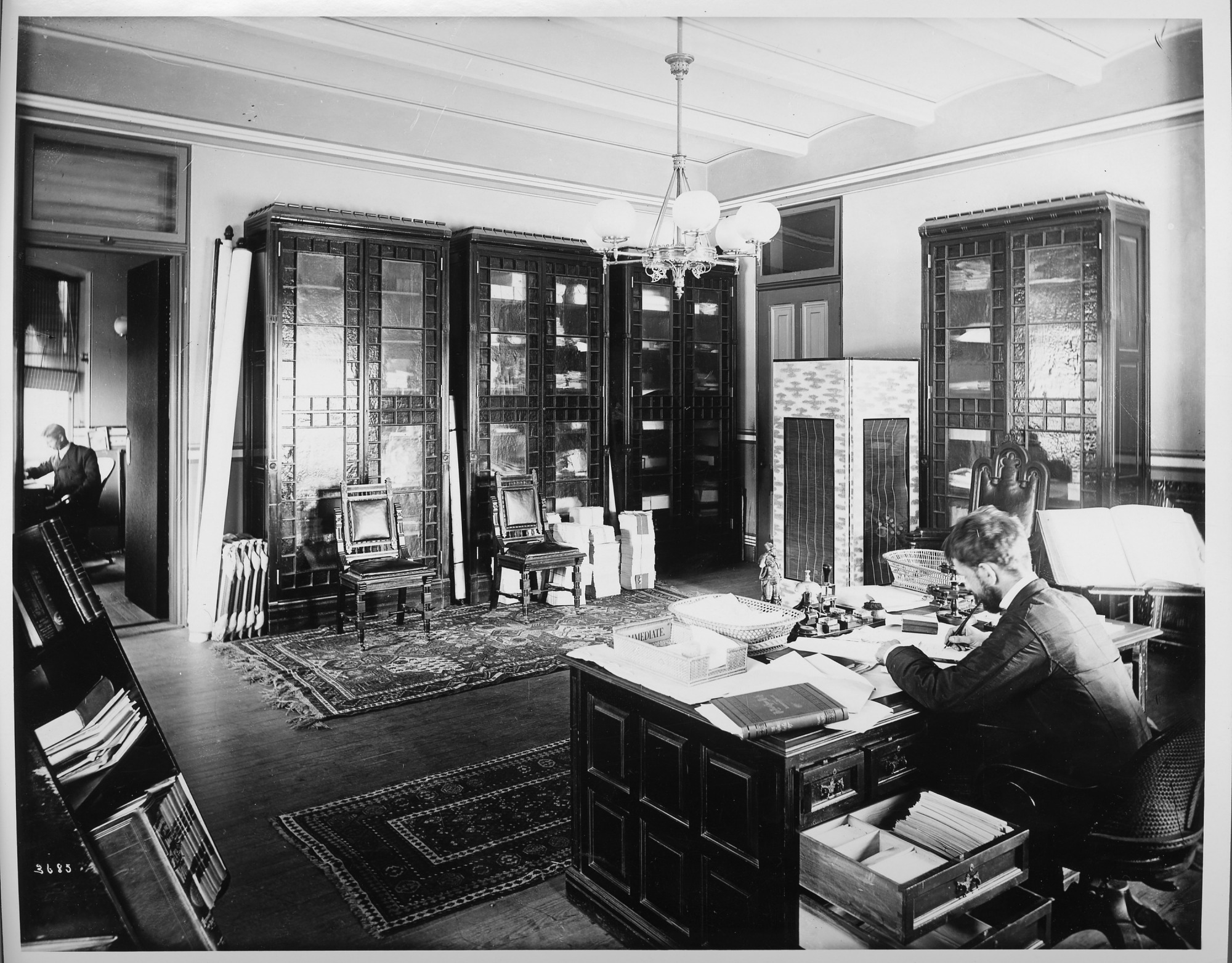 A Smithsonian employee at work in an office in the United States National Museum, now the Arts and Industries Building. Seated at his desk, he is surrounded by cabinets and bookcases. Another office is visible in background.