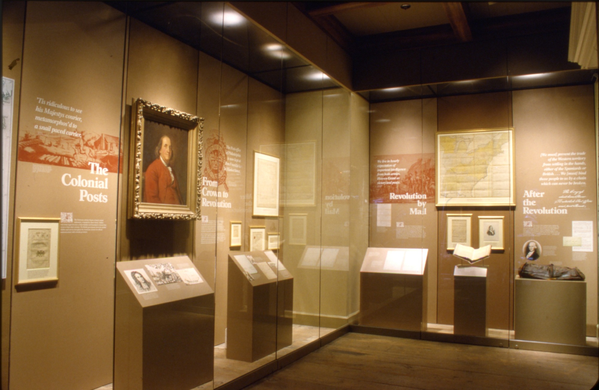 The "Starting the System" section of the "Binding the Nation" exhibit at the National Postal Museum, located in the Old Washington City Post Office building. The exhibit features manuscripts and artifacts from the earliest years of the United States postal system.
