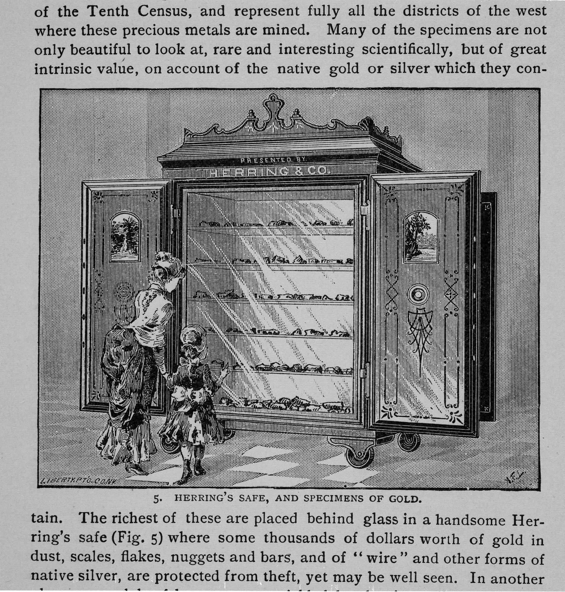 Illustration (Fig. 5) in "A Handbook to the National Museum under the direction of the Smithsonian Institution, Washington" of a mother and child looking at a popular exhibit of some thousands of dollars worth of gold in dust, scales, flakes, nuggets and bars, and native silver which are behind glass safely stored in a Herrings' safe where they are protected from theft, yet may be well seen. The metallurgy exhibit demonstrated how man worked metals from ores. The ores were gathered mostly by agents of the Tenth Census, and represented fully all the districts of the west where the precious metals were mined.