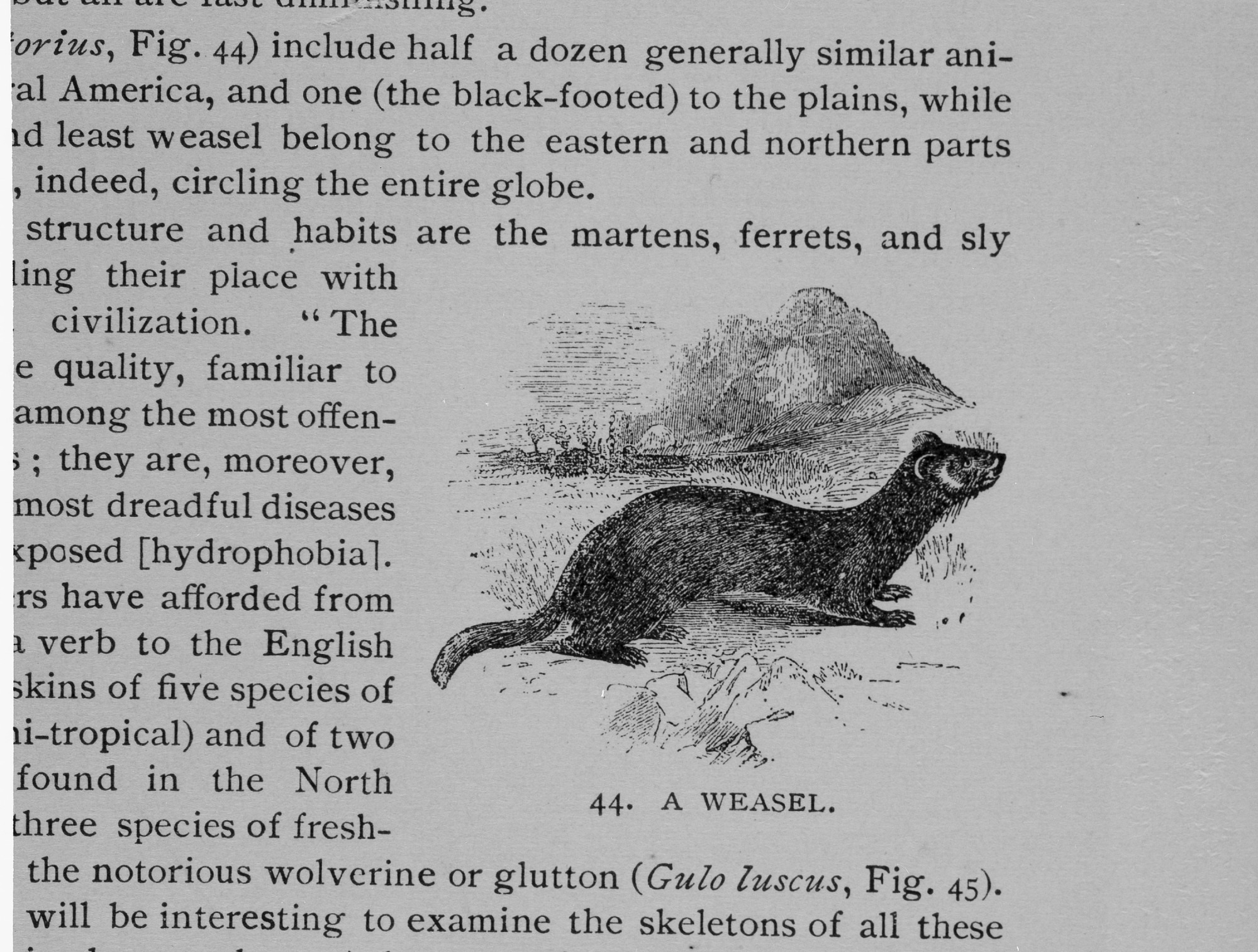Illustration (Fig. 41) in "A Handbook to the National Museum under the direction of the Smithsonian Institution, Washington" of a weasel, an animal family which exists in most parts of the globe except Australia, but reaches its highest development in the northern hemisphere.