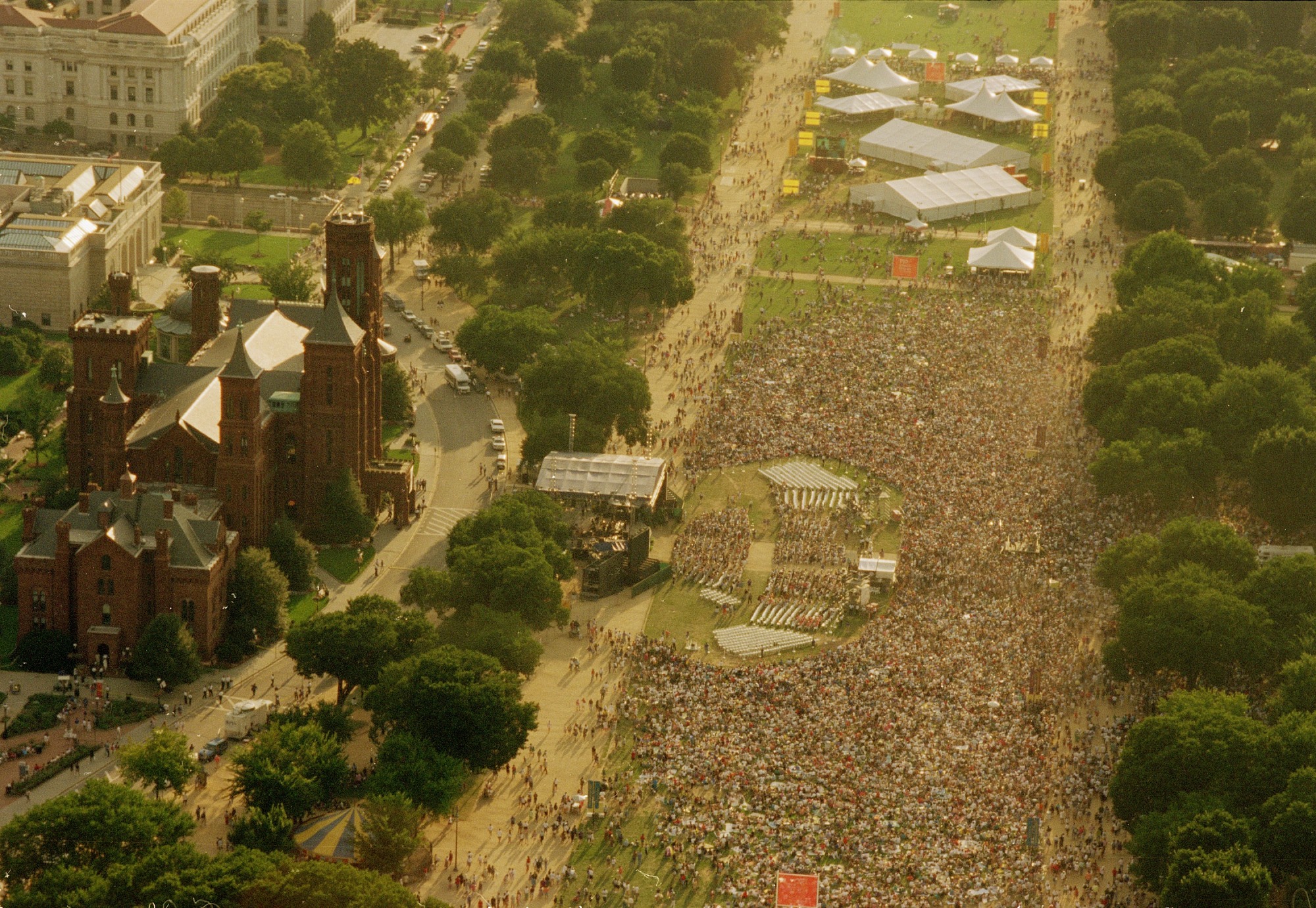 An aerial photograph of the National Mall on August 10, 1996. The Mall is packed with people for the Birthday Party on the Mall celebration of the Smithsonian Institution's 150th anniversary. The Smithsonian Institution Building is on the left with the crowd gathered around the stage set up in front of the building for the concert, which was later followed by fireworks.