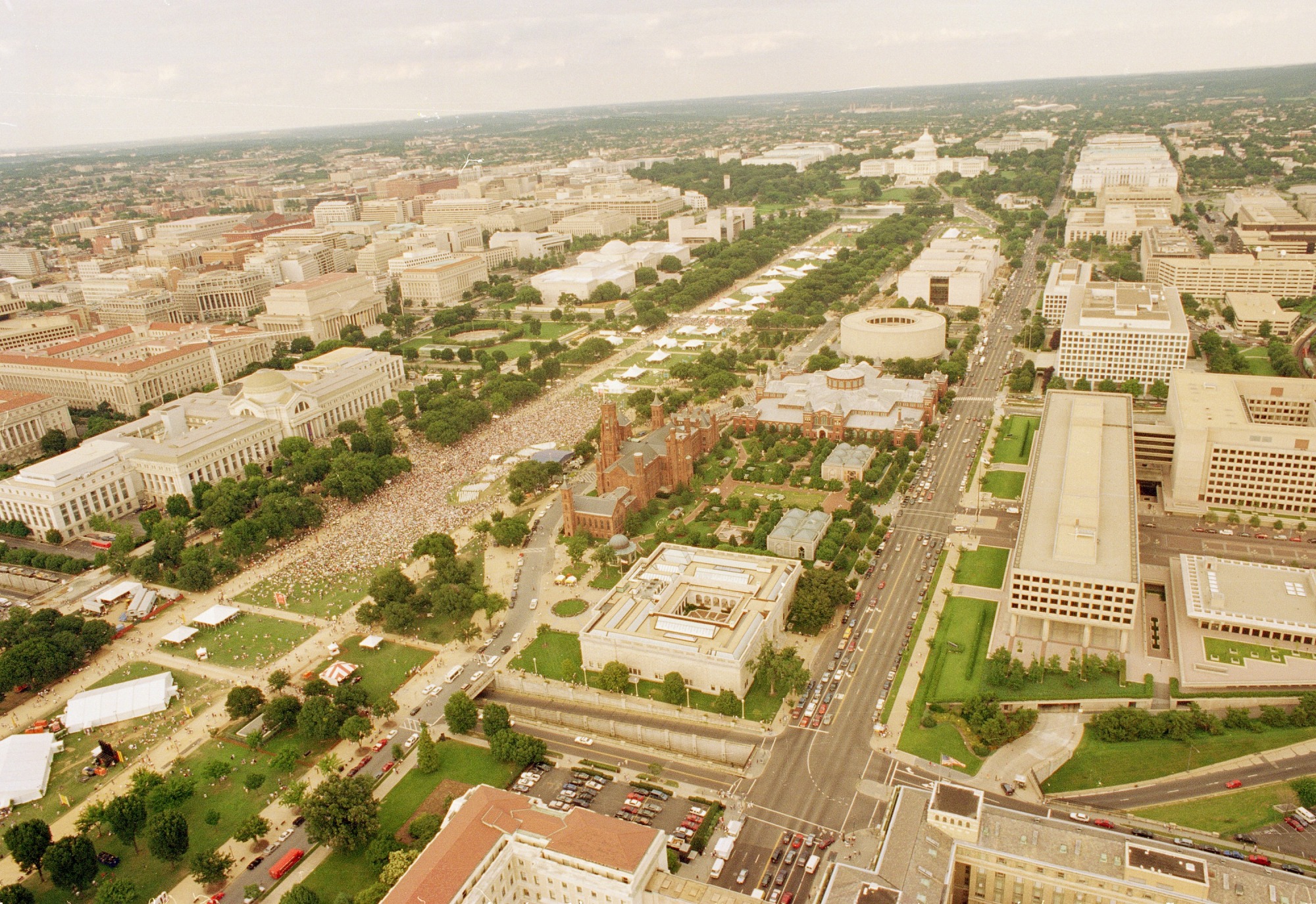 An aerial view of the National Mall and the Smithsonian Museums looking east towards the United States Capitol Building, August 10, 1996. The Mall is filled with people and tents for the Birthday Party on the Mall celebrating the Smithsonian's 150th anniversary. Buildings that can be seen in the photograph are the Freer Gallery of Art, the Smithsonian Institution Building, Arts and Industries Building, Hirshhorn Museum, National Air and Space Museum, National Museum of Natural History, National Gallery of Art, United States Capitol Building, National Archives and Records Administration, and the Department of Energy Forrestal Building.