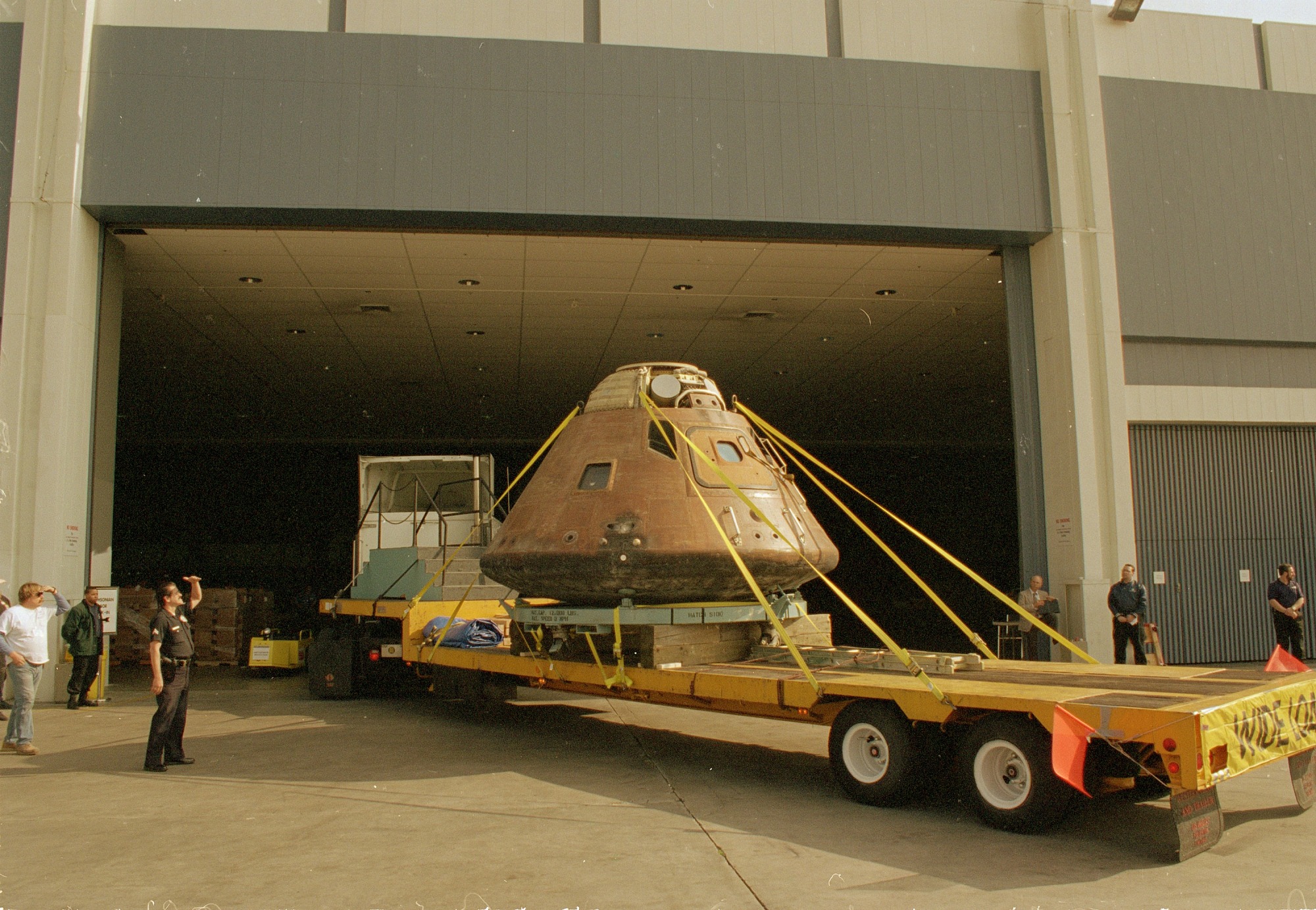 The Apollo 14 command module "Kitty Hawk" on a flat bed truck prior to being moved into the Los Angeles Convention Center. The Convention Center was the first stop of the "America's Smithsonian" exhibition national tour celebrating the Smithsonian's 150th anniversary. The exhibition opened in Los Angeles on February 9, 1996.